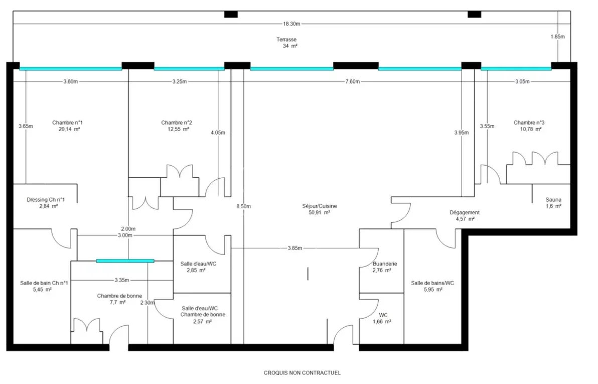 1 living room, 1 American kitchen, 1 bedroom (20.14 m2), 1 bathroom/WC, 1 bathroom/WC, 2 bedroom (12.55 m2), 3 bedroom (10.78 m2), 1 shower/WC, 1 laundry, 1 changing room, 1 terrace 34 m², 1 parking.