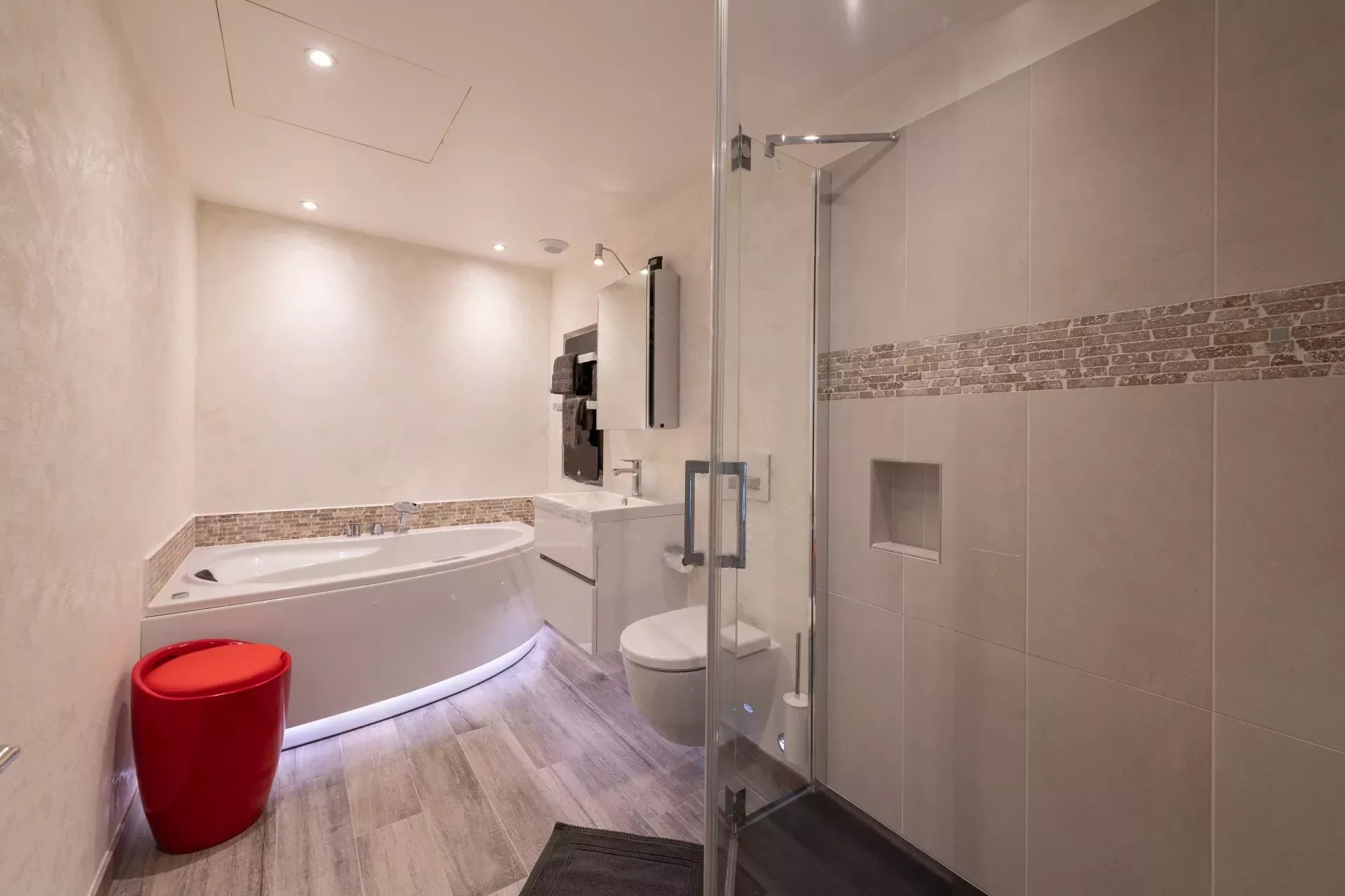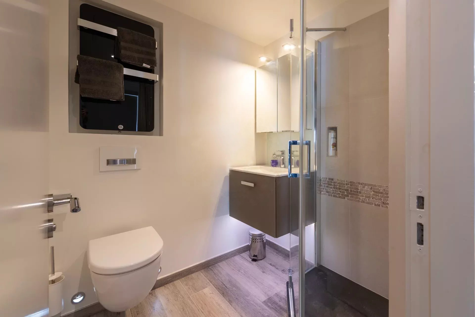 The main room offers spacious living space including living room, dining room and fully equipped American kitchen. The master bedroom has a walk-in closet and full bathroom. Two other bedrooms, one with a double bed and an attached bathroom, and a third bedroom with two single beds, are also present. In addition, there is a shower room with toilet. A guest toilet and laundry room add practicality.
