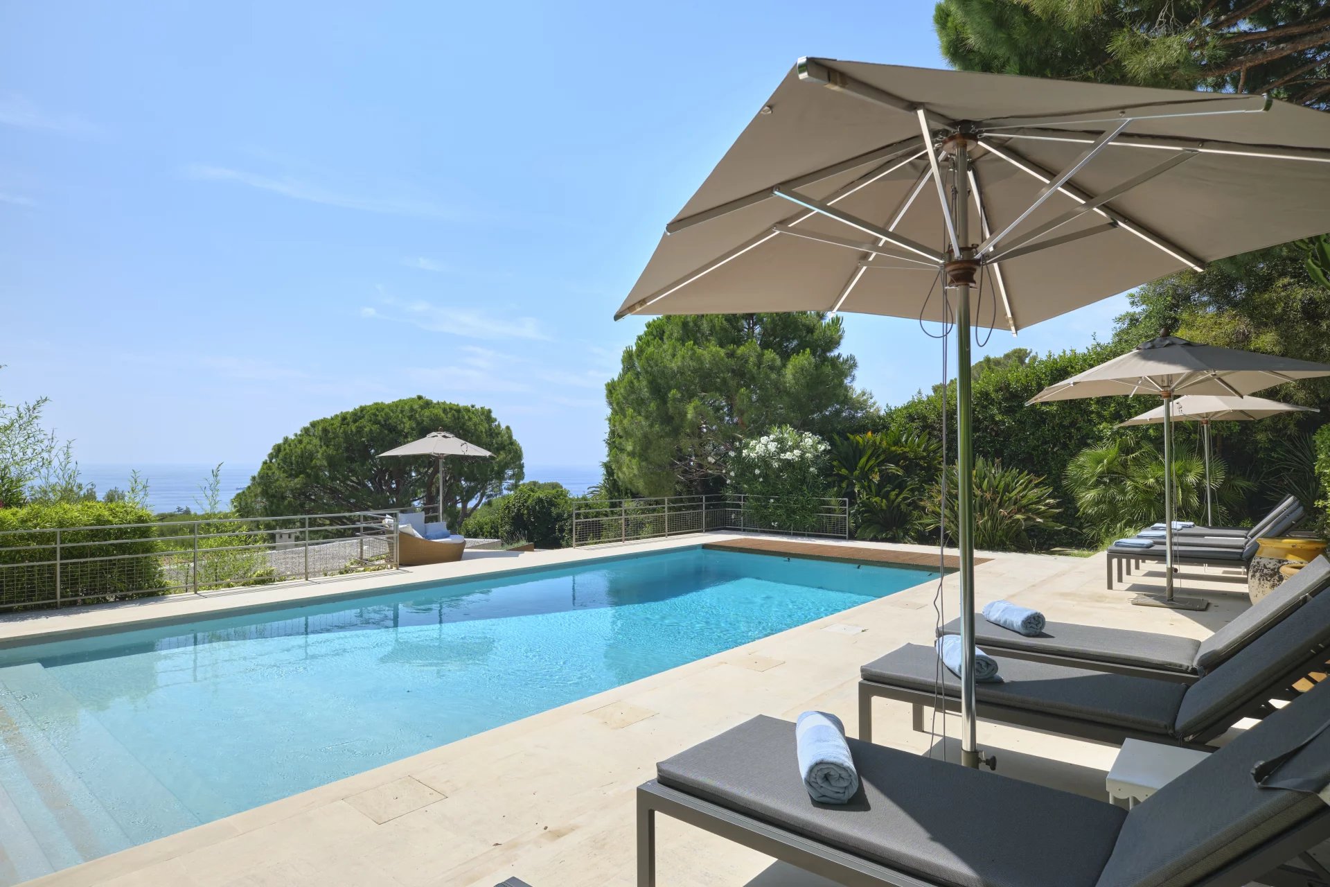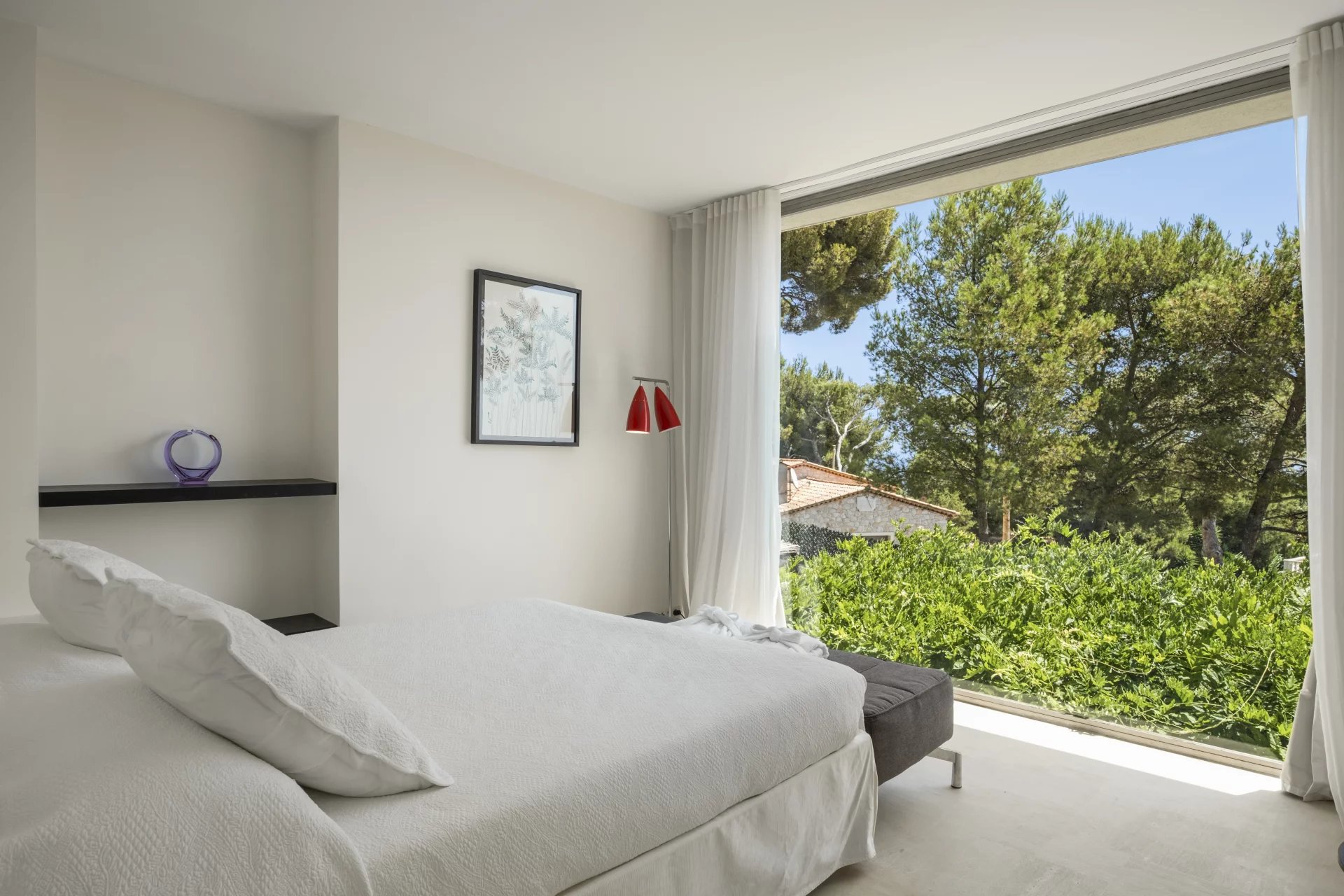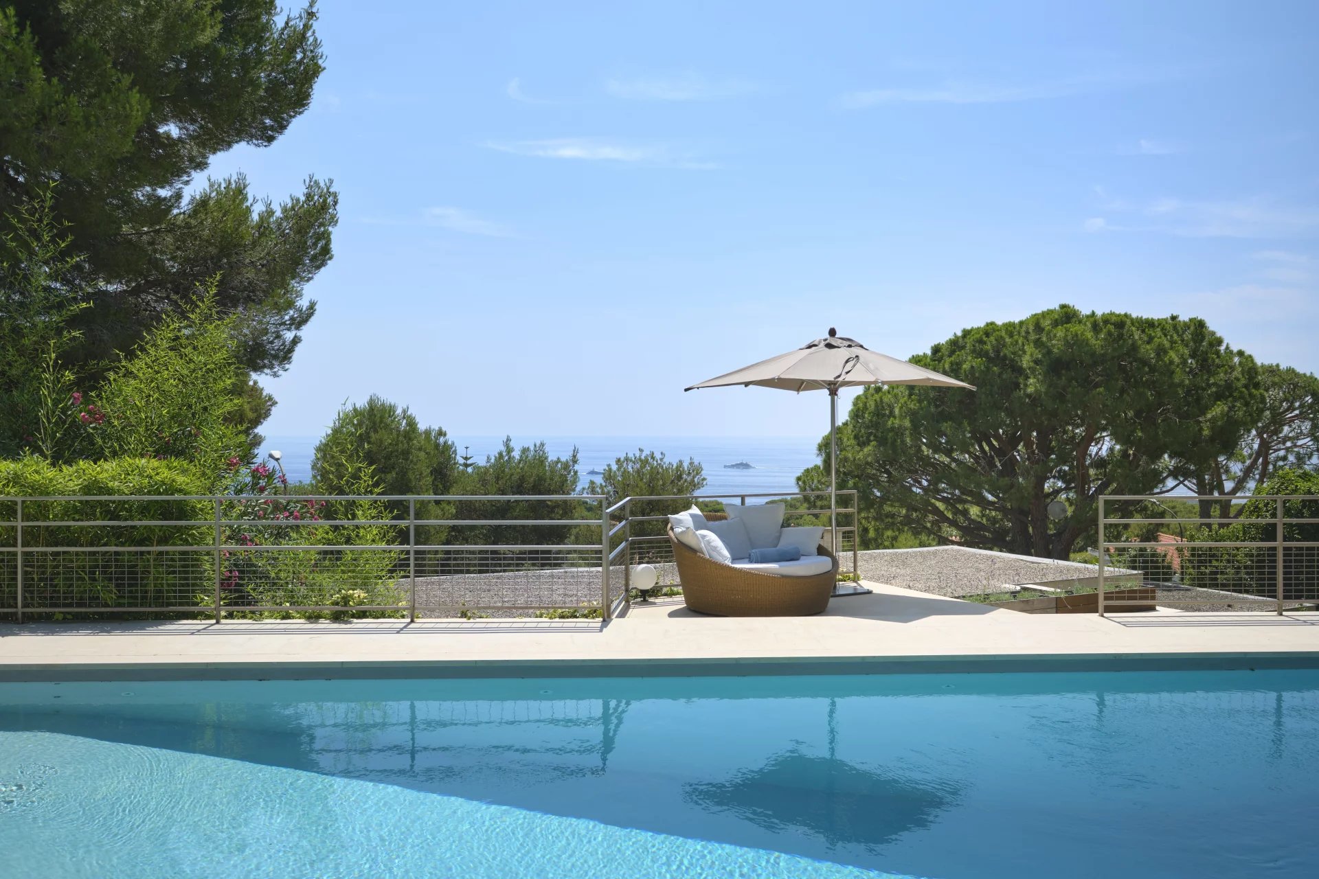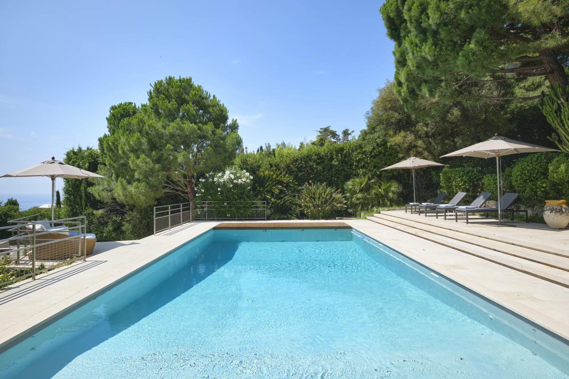 In a quiet and residential area in the heart of Cap Ferrat, a very beautiful modern Californian style villa, with approximately 250 m² of living space on a plot of approximately 3,500 m². Swimming pool (15 m x 10) with a beach, beautiful sea view, exotic garden with a Japanese pond.