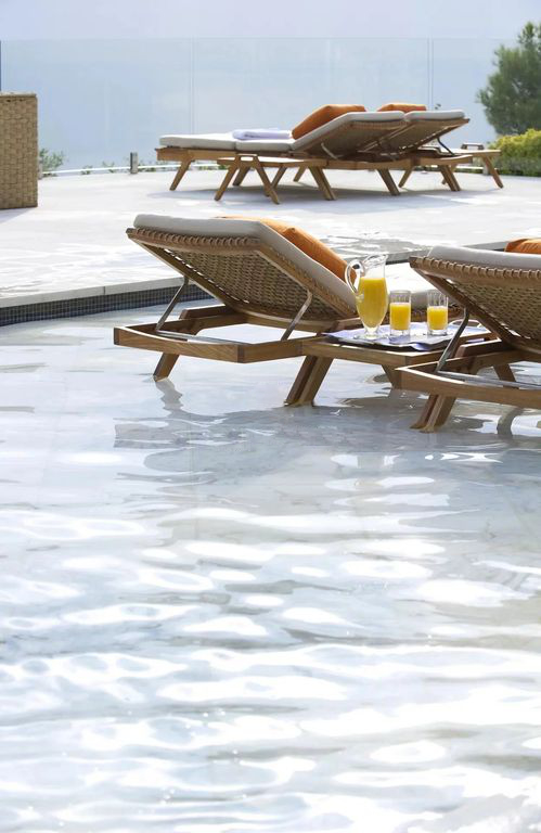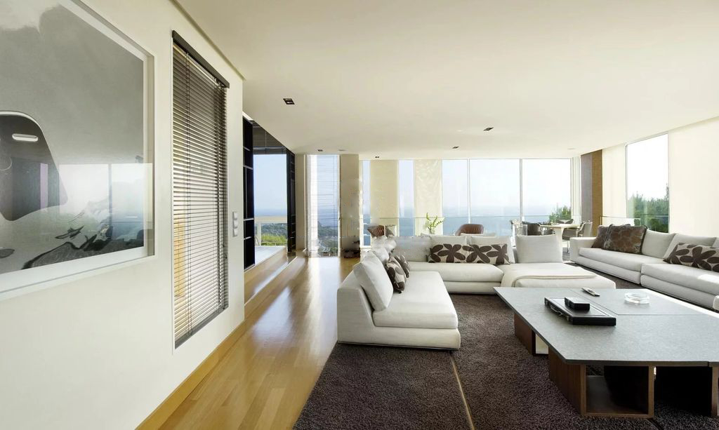 The property also has a large swimming pool with a movable marble floor, offering panoramic sea views, while a second indoor pool enhances the swimming experience.