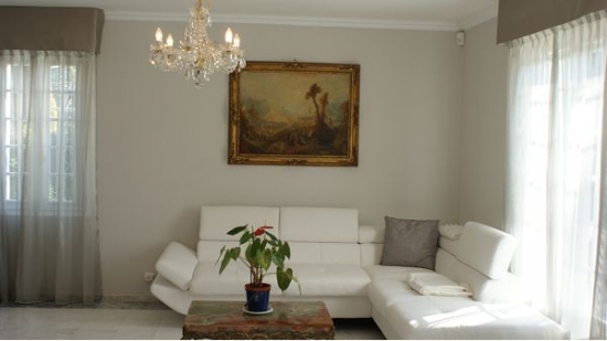 Rez de chaussée: Grand salon avec des canapés confortables , une télévision et une grande table à manger . Chambre des maîtres avec salle de bains avec douche et WC, a une sortie sur le jardin. Nouvelle cuisine équipée, avec accès au jardin .