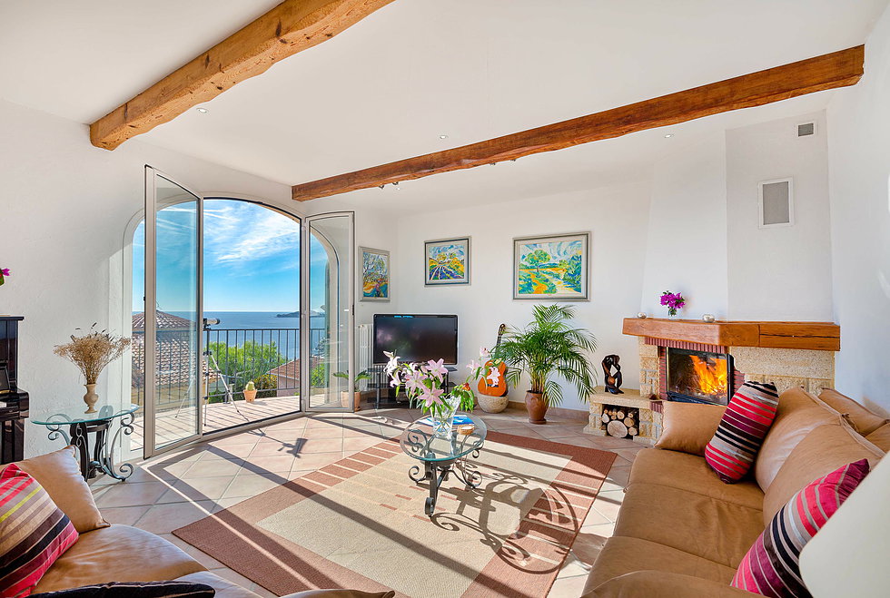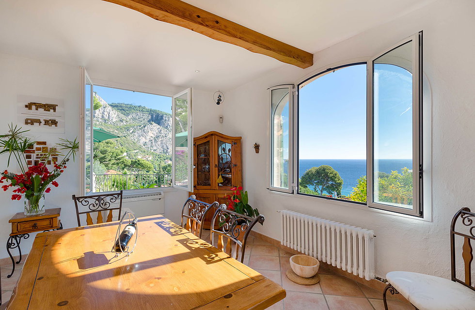 Cette villa joliment meublée profite pleinement de ses racines provençales avec des sols en tuiles, des plafonds en bois exposés et un grand salon ouvert, chaleureux et rustique. Ce salon spacieux s'ouvre sur les grandes terrasses privées, parfait pour un repas romantique tout en profitant de la vue spectaculaire sur la Méditerranée, le jardin et la montagne. Une cheminée en bois, un piano et deux canapés en cuir confortables forment une zone de conversation relaxante près des fenêtres voûtées donnant sur la mer.