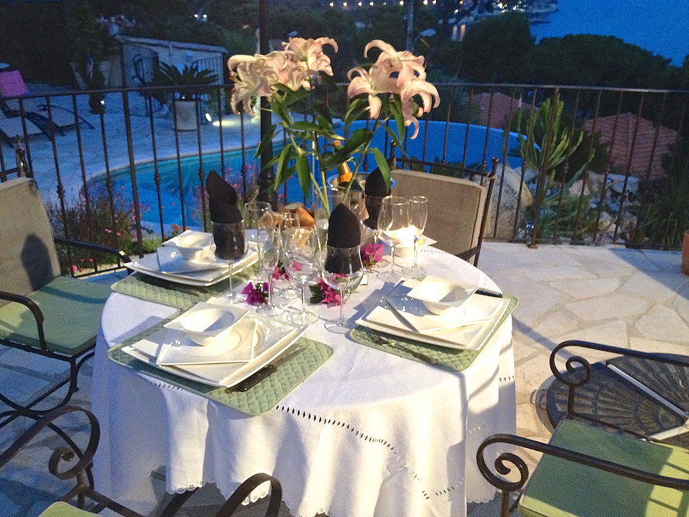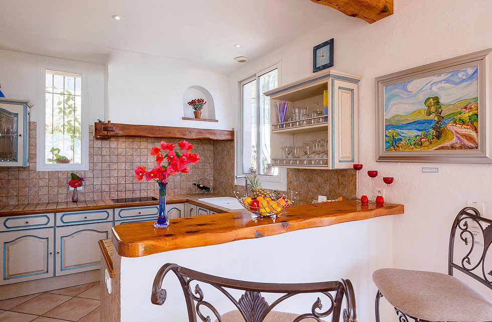 À l'autre bout de la pièce, la salle à manger spacieuse et provençale, également avec vue sur la mer, dispose d'une table en bois et en fer forgé. La cuisine ouverte entièrement équipée a: