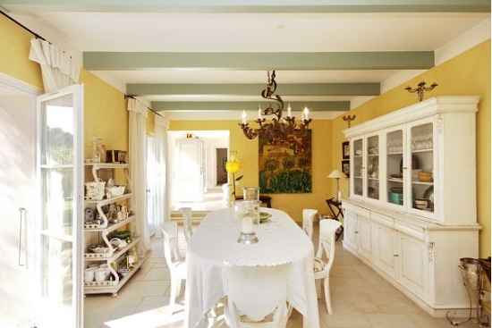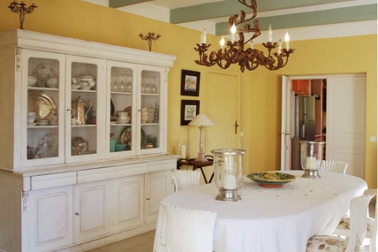 Grande salle à manger pour 6 personnes avec une vitrine avec des ustensiles de collection