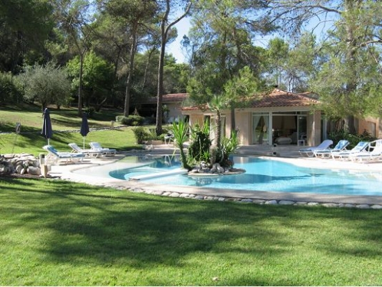 Une grande piscine et un oasis de forme inhabituelle avec des palmiers dans le centre. Petite maison près de la piscine avec cuisine et bar et une table pour 18 personnes. Terrasse avec salle à manger et un coin salon, avec une cuisine extérieure supplémentaire.
