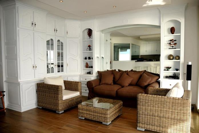 Séjour avec cuisine américaine et accès à la terrasse avec une vue magnifique sur la mer.
