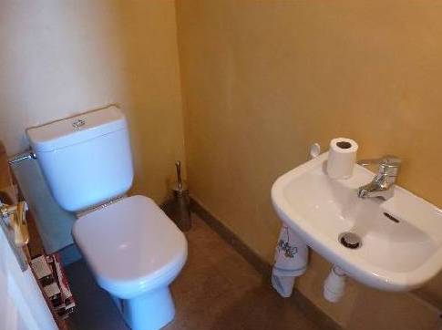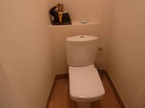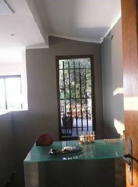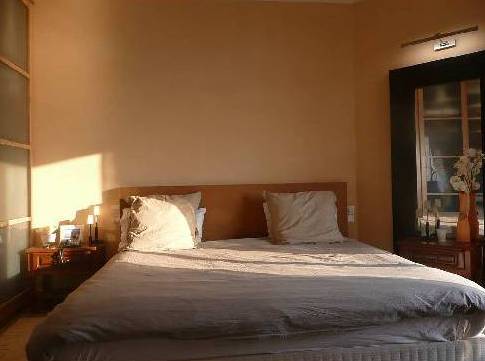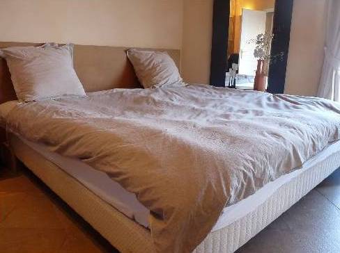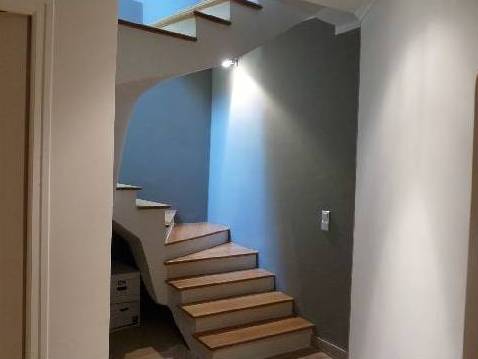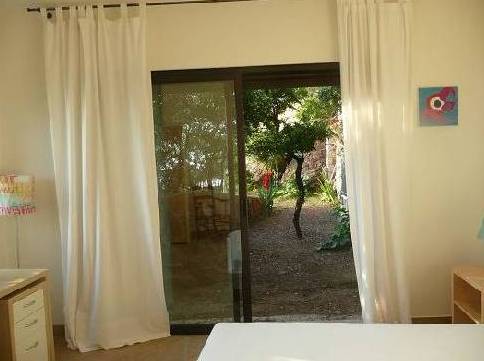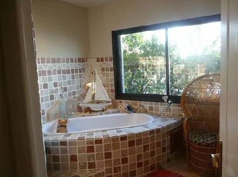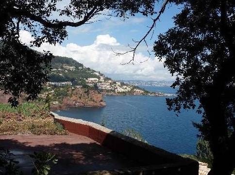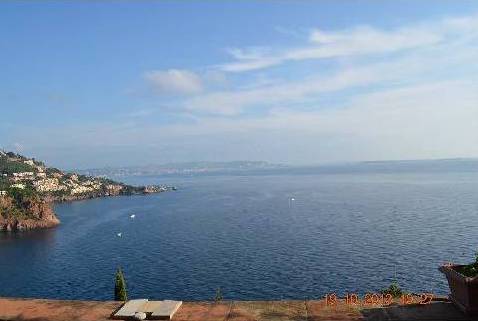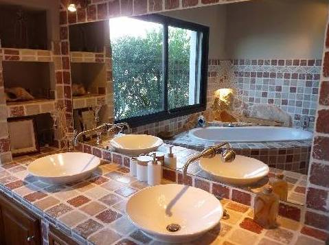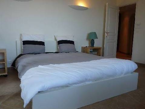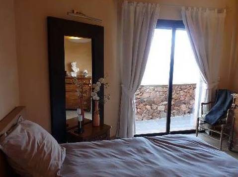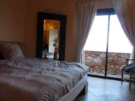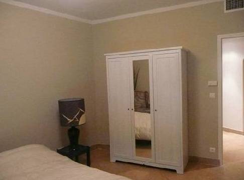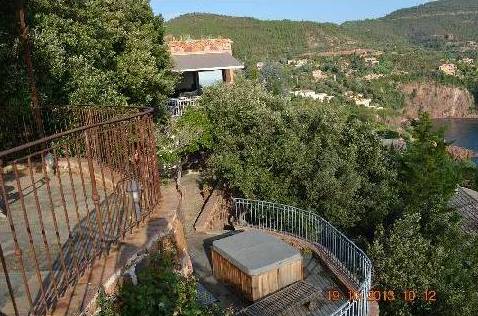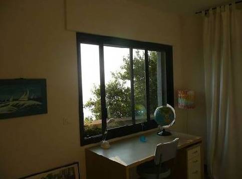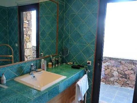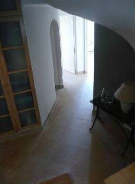 En descendant les escaliers, situés à côté de l'entrée, nous nous trouvons au rez-de-chaussée où il y a deux chambres, deux avec lits doubles, placards et accès à la terrasse inférieure. Et une grande salle de bains avec douche et baignoire, faite d'une mosaïque, et deux lavabos. Bath en forme de croissant est situé à côté de la fenêtre panoramique, où vous ne le voit, mais vous pouvez profiter de la vue sur les îles de Lérins. En face de la salle de bain est un WC séparé.