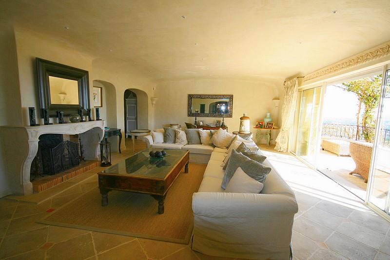 Grand salon avec cheminée et accès à la terrasse.