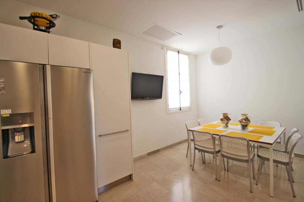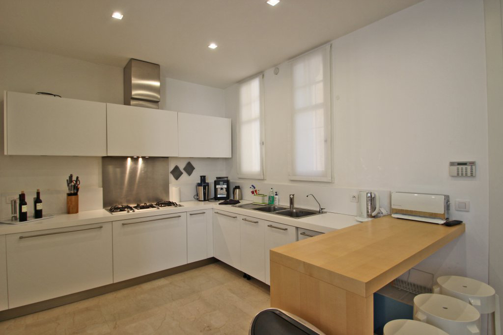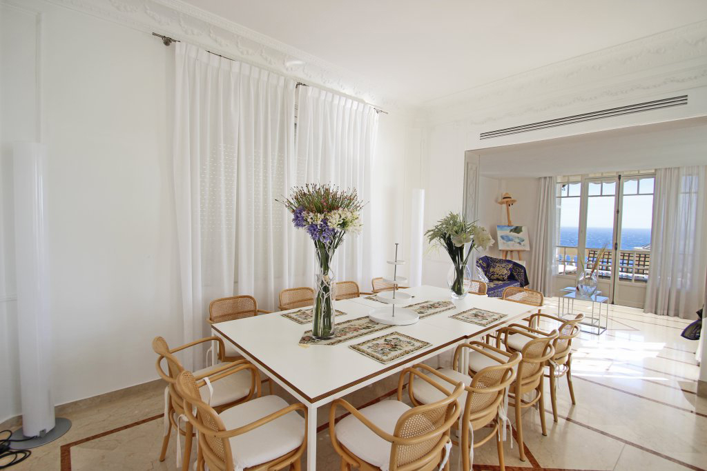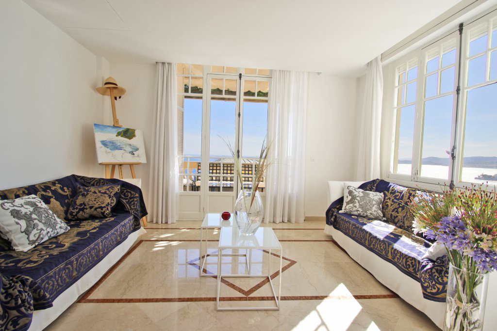 Une cuisine et son coin repas donnant sur l’extérieur, un double salon salle à manger , ouvrant sur une loggia face à la mer, les toilettes invités.