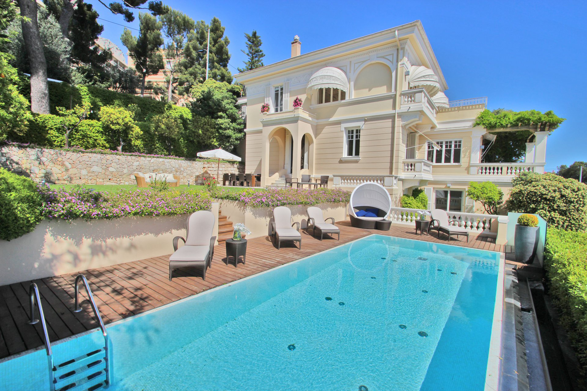 Le jardin plat est bordé sur sa limite sud par une très belle piscine chauffée à débordement , un coin cuisine d'été . La villa dispose d’un garage fermé et de deux places de parkings.
