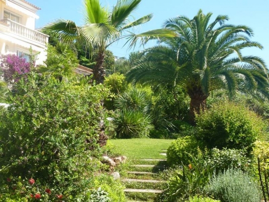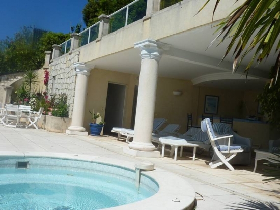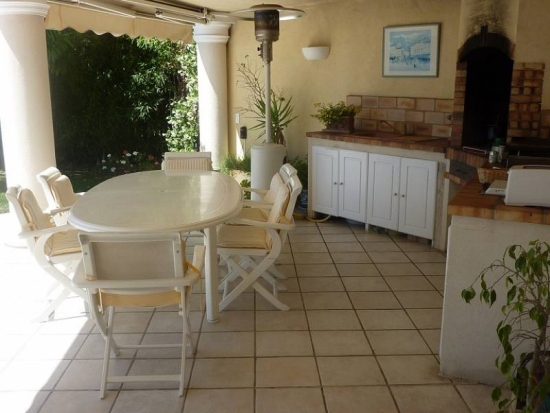 Jardin avec piscine et cuisine d'été.