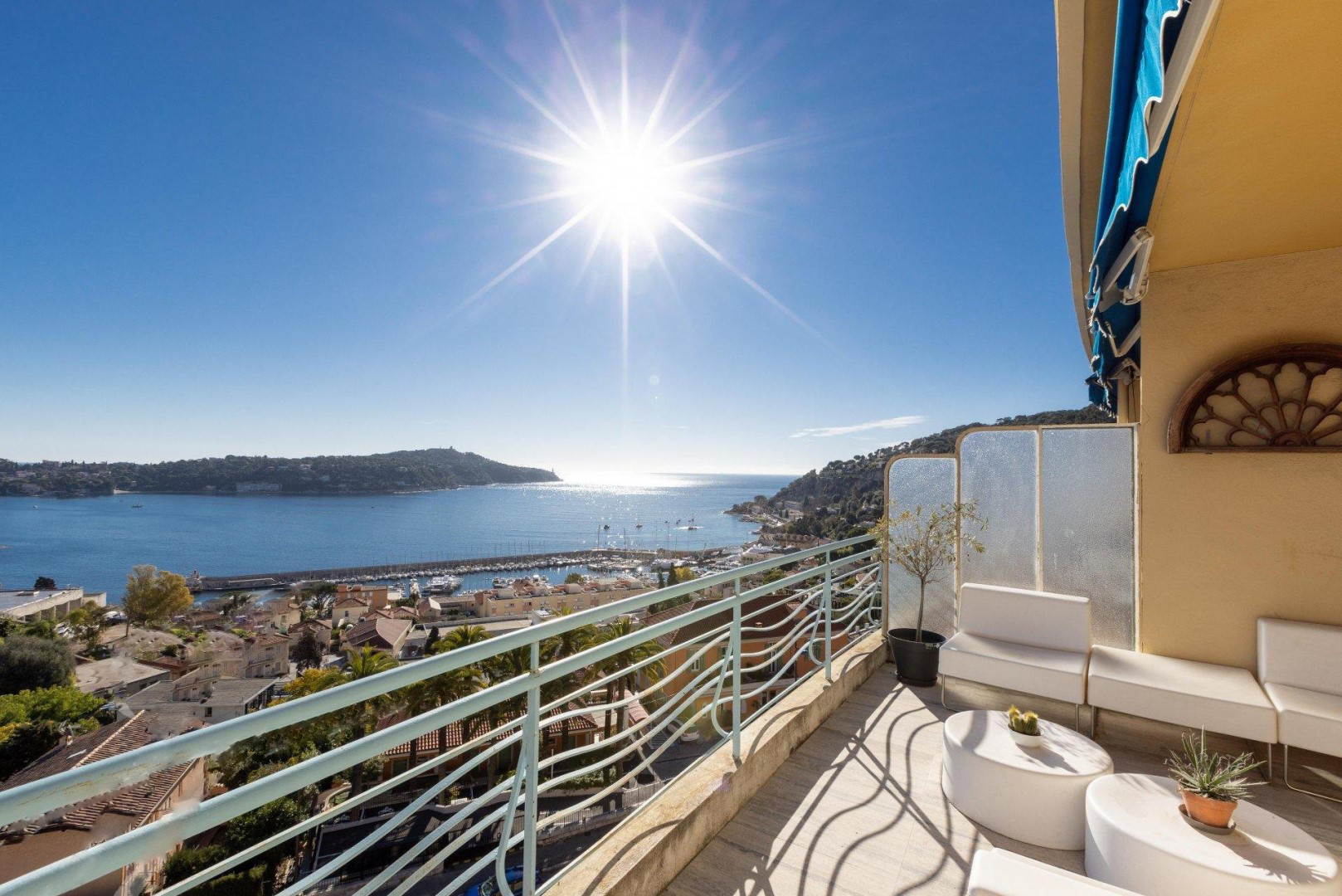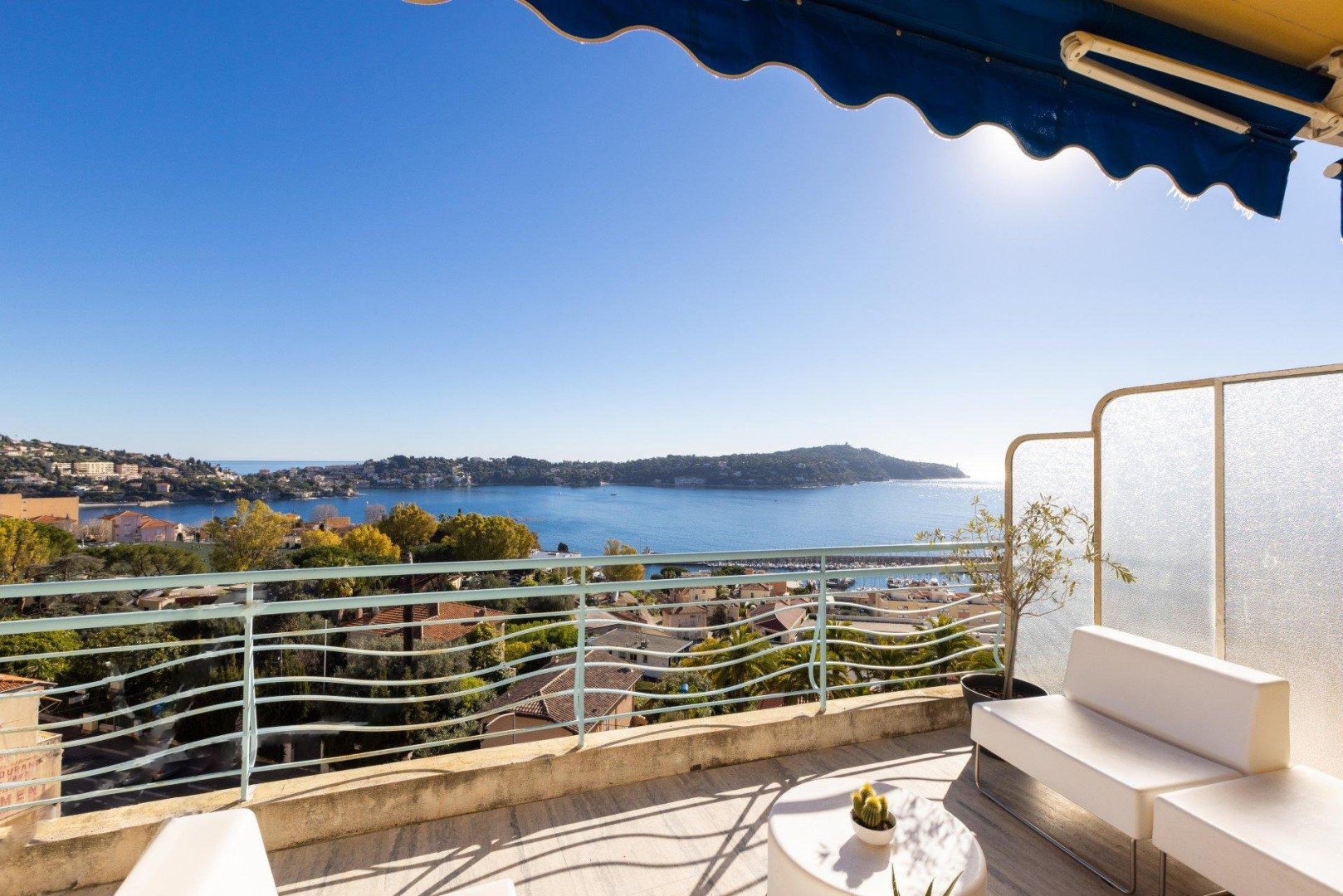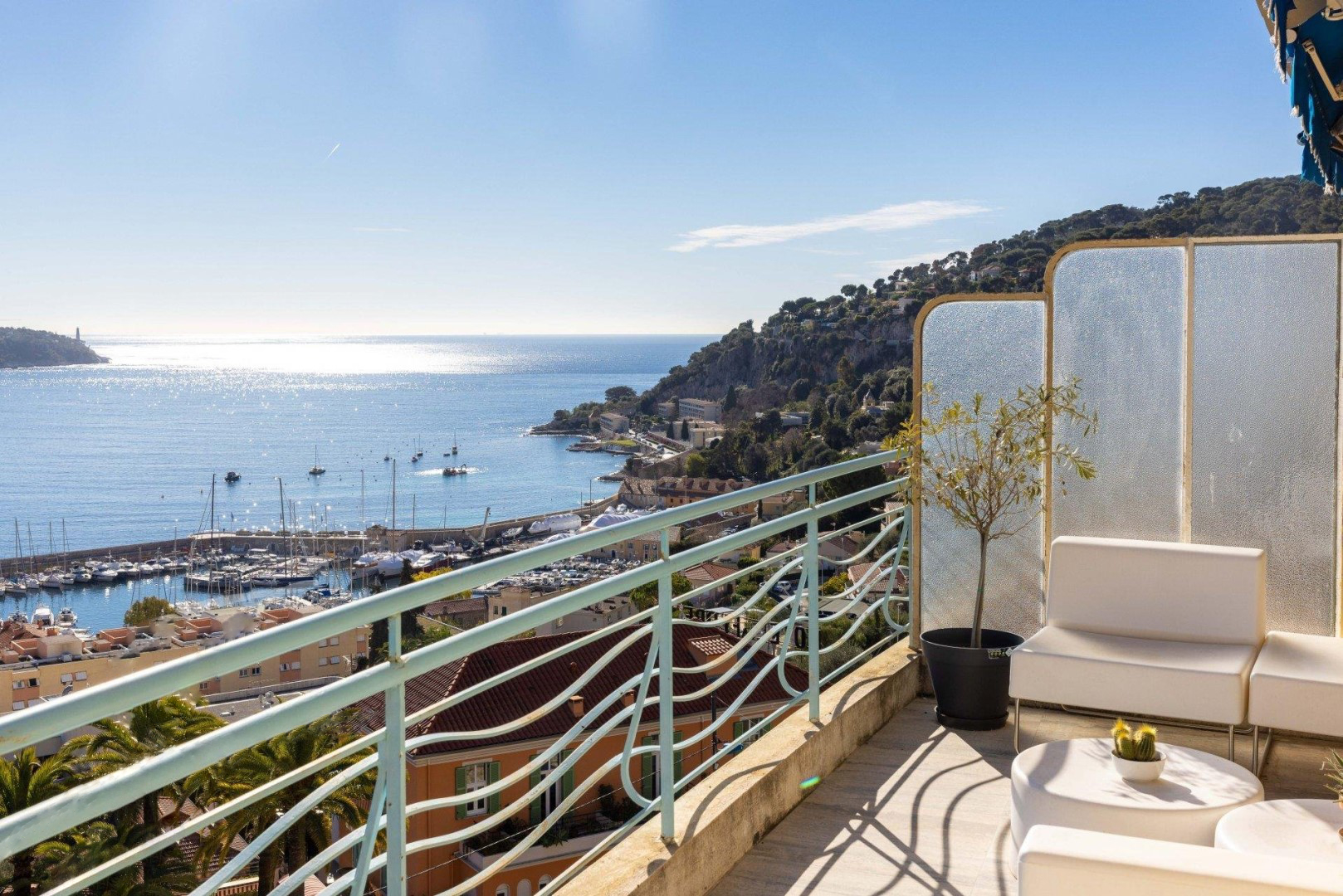 L'appartement offre sur 111 m2 : grand séjour/salle à manger donnant sur une terrasse avec vue sur la baie de Villefranche et le Cap Ferrat, cuisine moderne entièrement équipée, 3 chambres avec débarras ouvrant sur un balcon donnant sur le jardin, salle de bains, salle d'eau, 2 toilettes. .