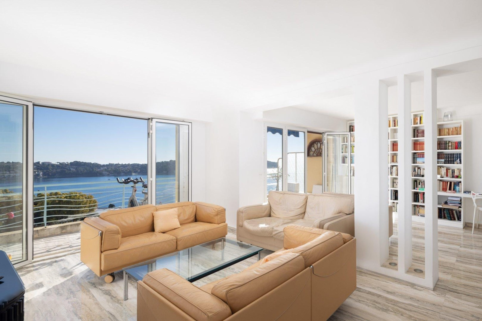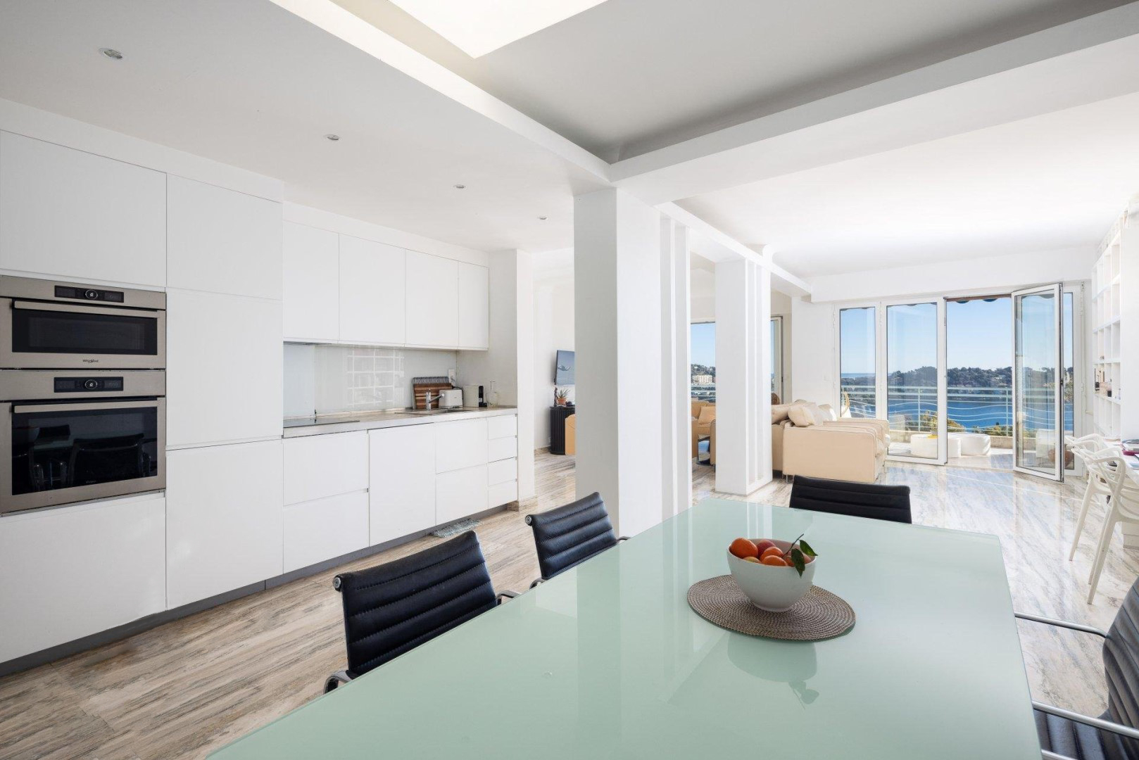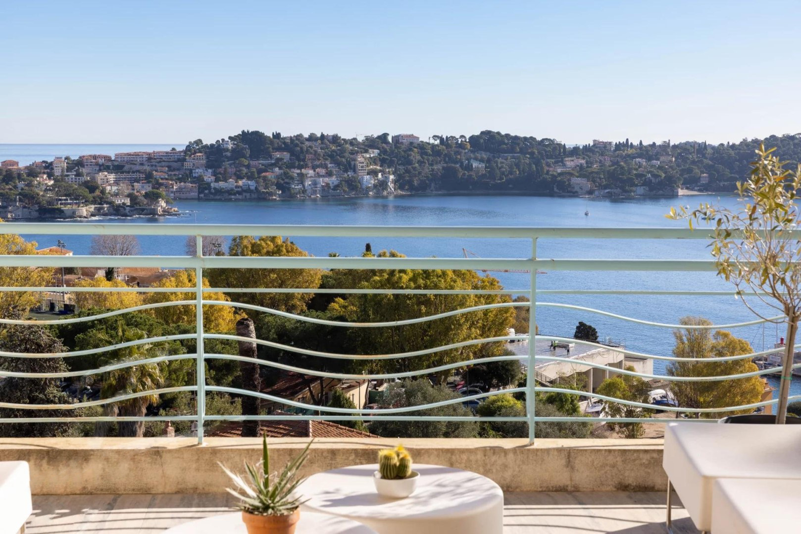 L'appartement offre sur 111 m2 : grand séjour/salle à manger donnant sur une terrasse avec vue sur la baie de Villefranche et le Cap Ferrat, cuisine moderne entièrement équipée, 3 chambres avec débarras ouvrant sur un balcon donnant sur le jardin, salle de bains, salle d'eau, 2 toilettes. .