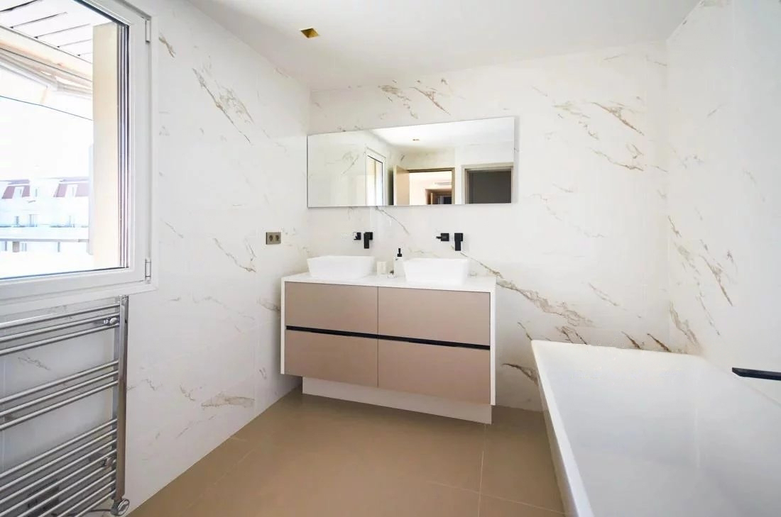 L'appartement est entièrement rénové, avec deux grandes terrasses de 24 m² et 50 m².