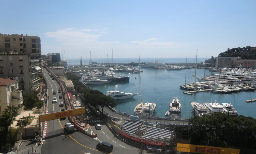 De la grande terrasse circulaire, vous avez une magnifique vue panoramique sur le port, la mer, le rocher et les célèbres circuits du Grand Prix de Formule 1 : le virage Saint-Devot et la montée vers l'avenue d'Ostende.