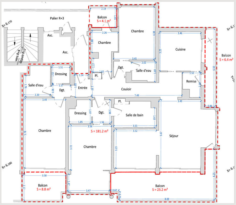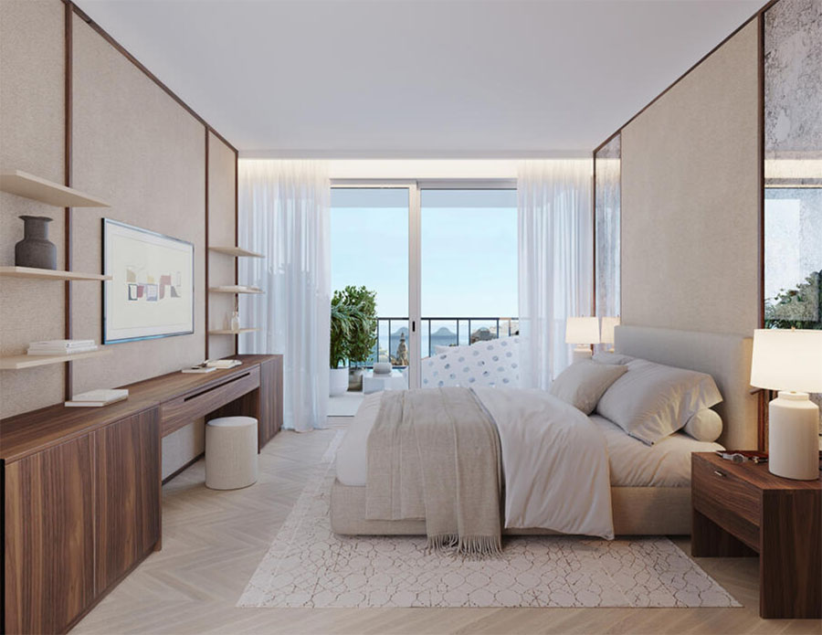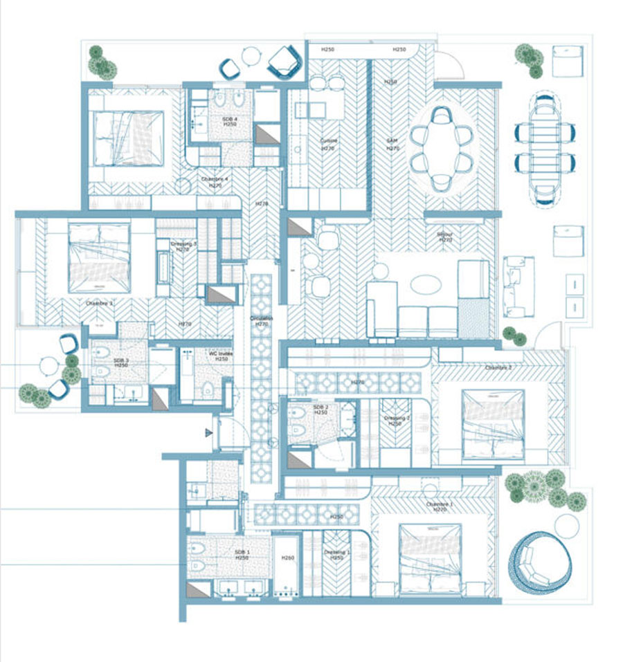 Cet appartement de 4 chambres se compose de : hall d'entrée avec couloir de distribution, grand séjour avec accès à un balcon vue mer et casino, cuisine séparée, 4 chambres, chacune avec salle de bain privative et dressing.