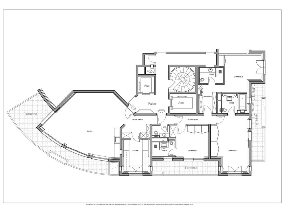 1 Hall d'entrée, 1 Salon, 1 Salle à manger, 1 Cuisine, 3 Chambres, 3 Dressings, 3 Salles de bains, 1 Terrasse (52 m2), 1 Cave, 1 Parking.
