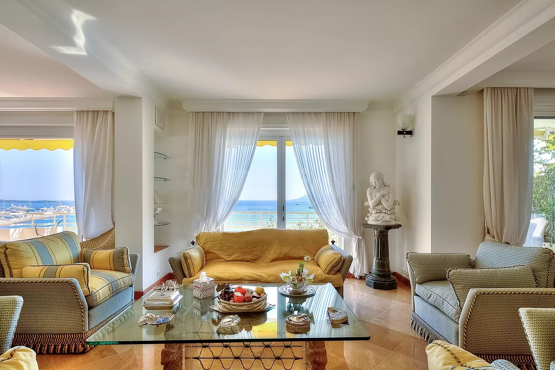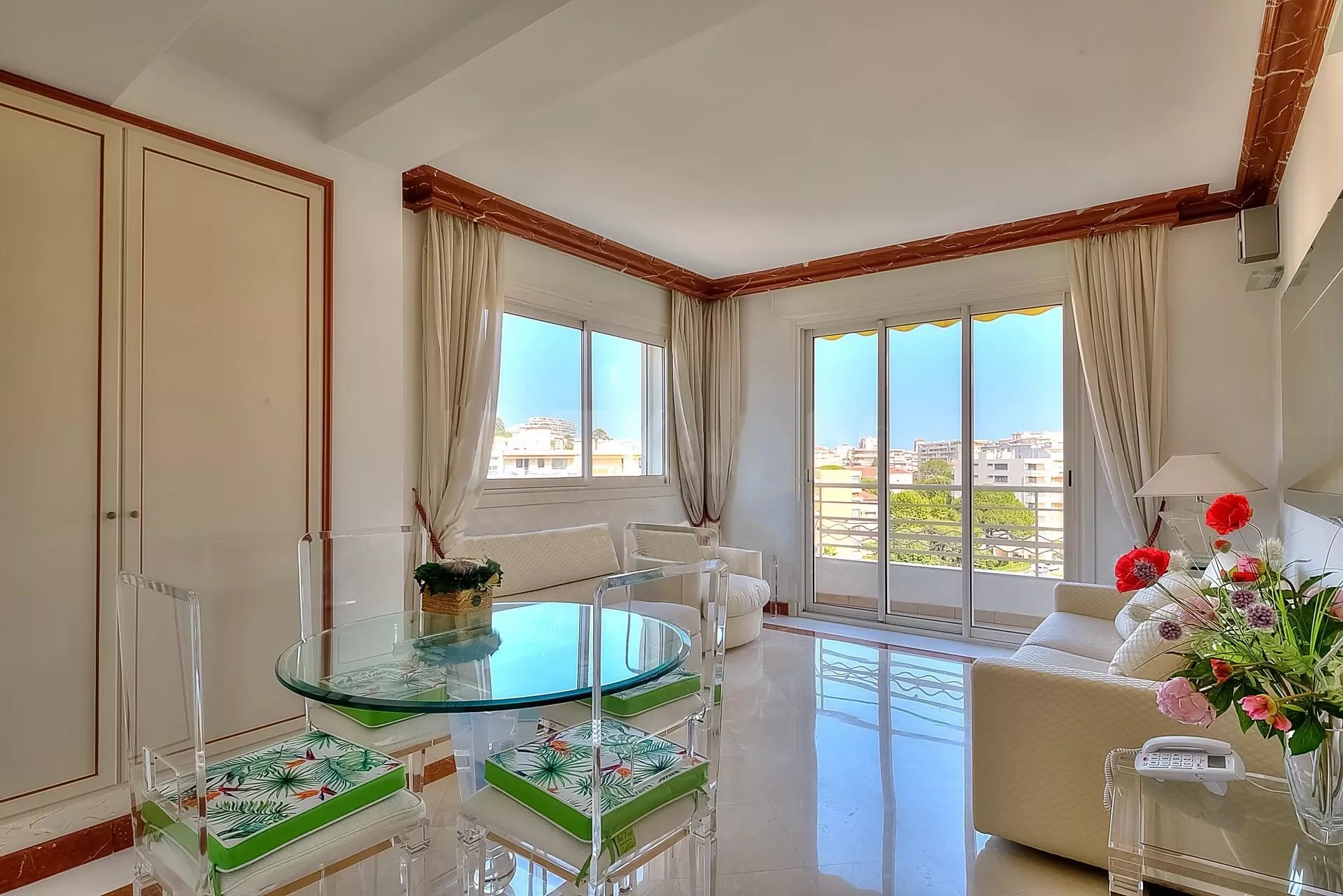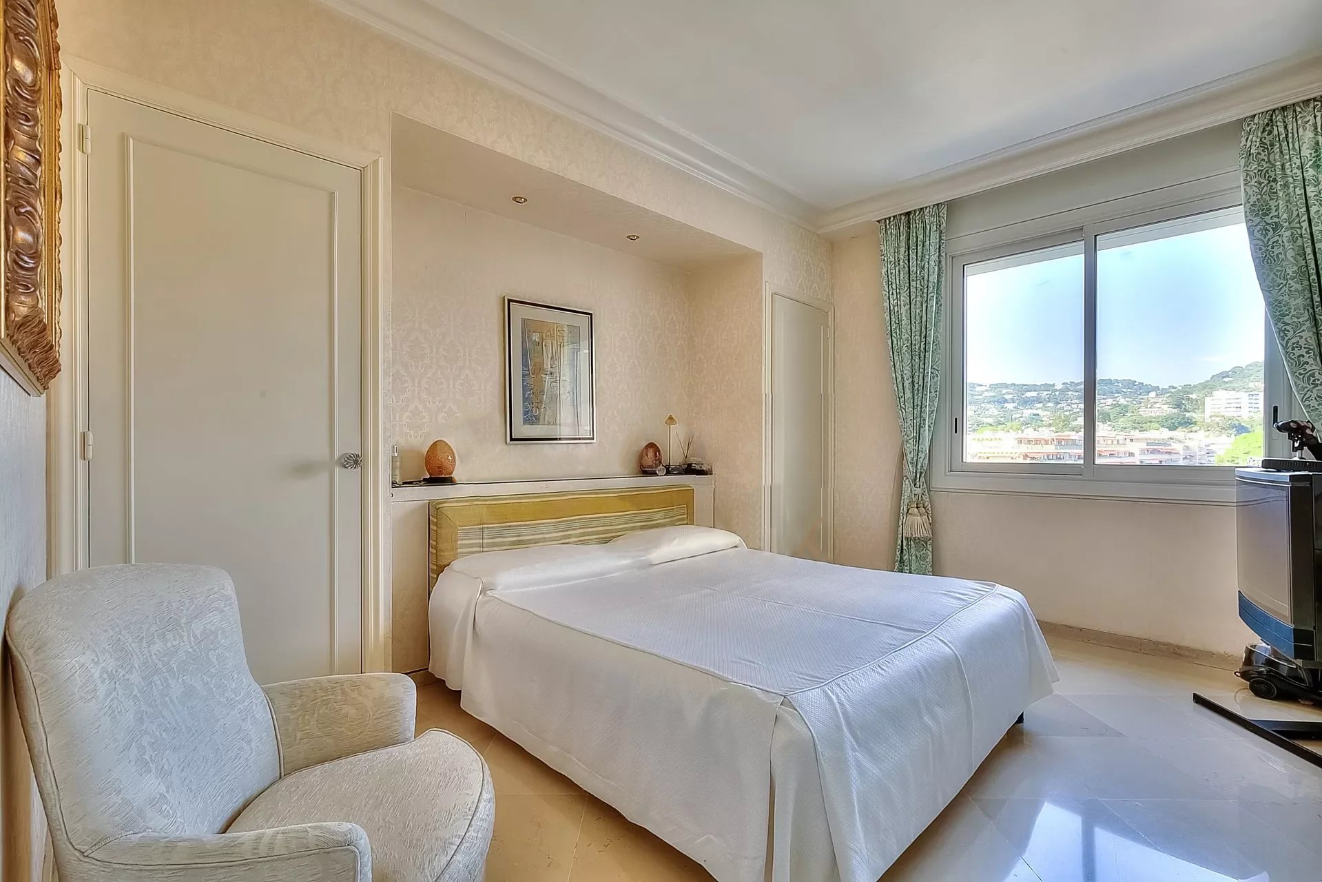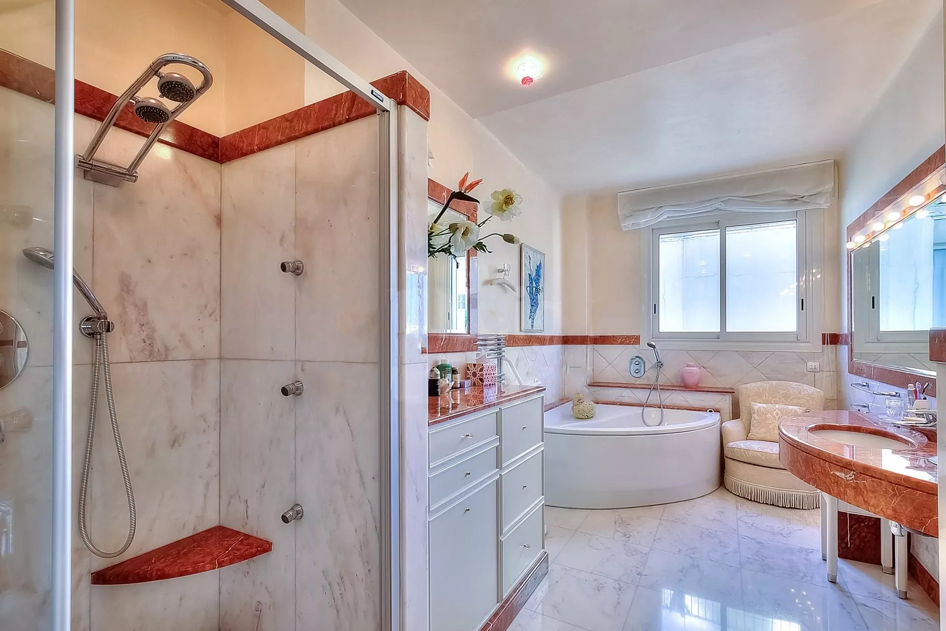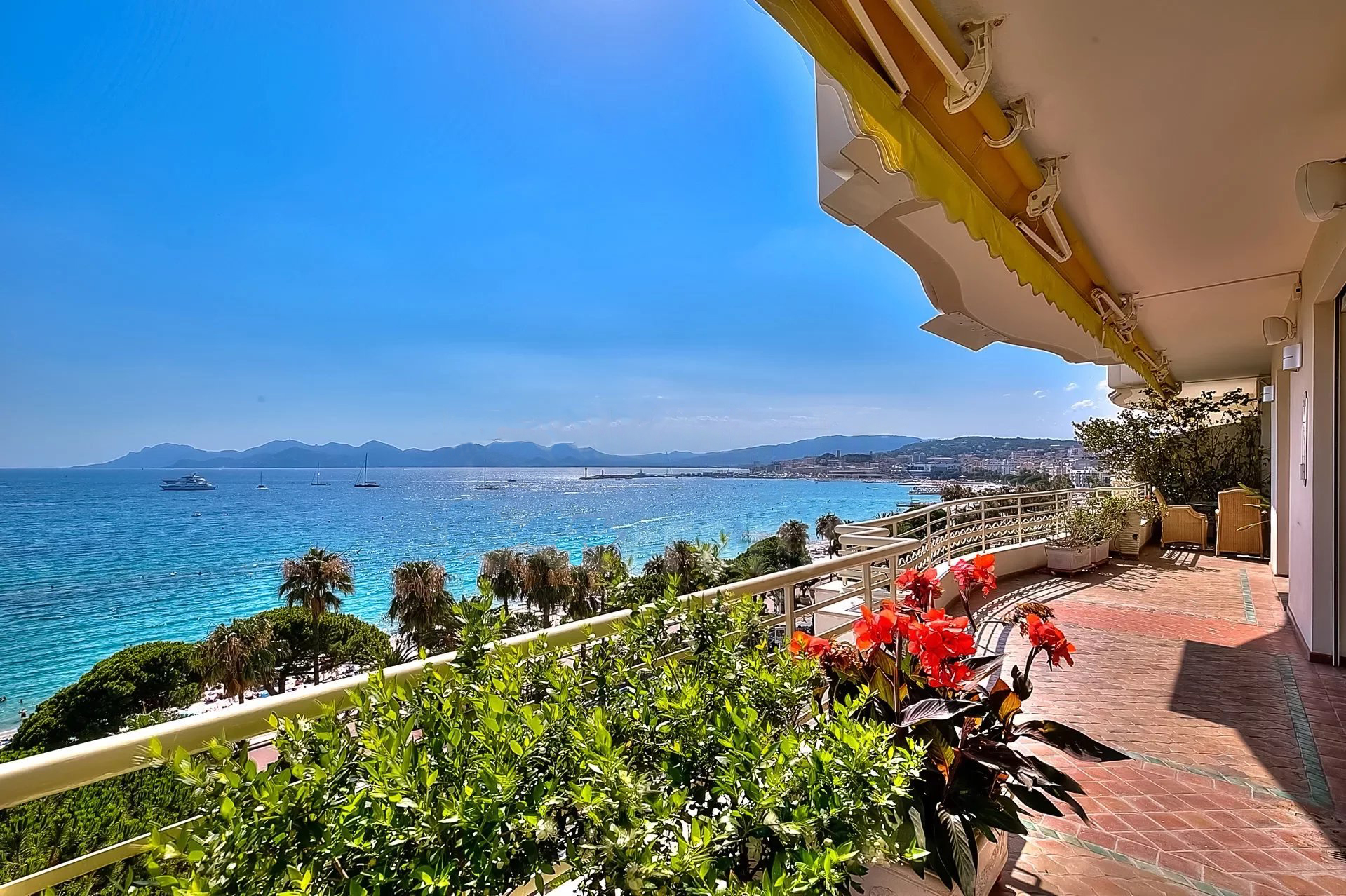 Décoration italienne avec un beau hall d'entrée, grand séjour de 95 m² avec bar ; Le séjour est situé à l'avant et s'ouvre sur une terrasse de 48 m² avec une vue imprenable sur la Baie de Cannes. Cuisine indépendante, 4 chambres, 4 salles de bains. Possibilité de 5ème chambre.