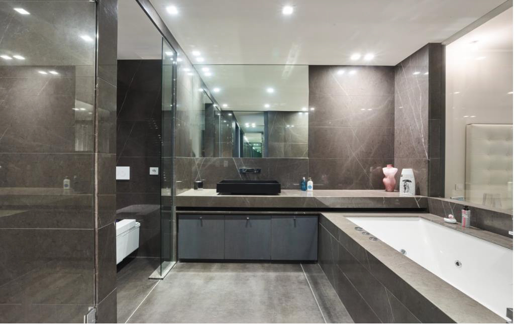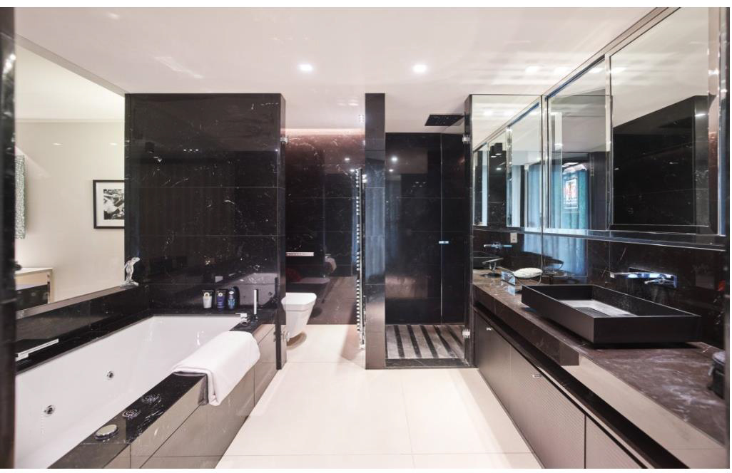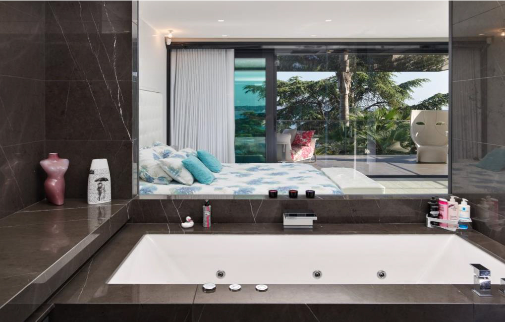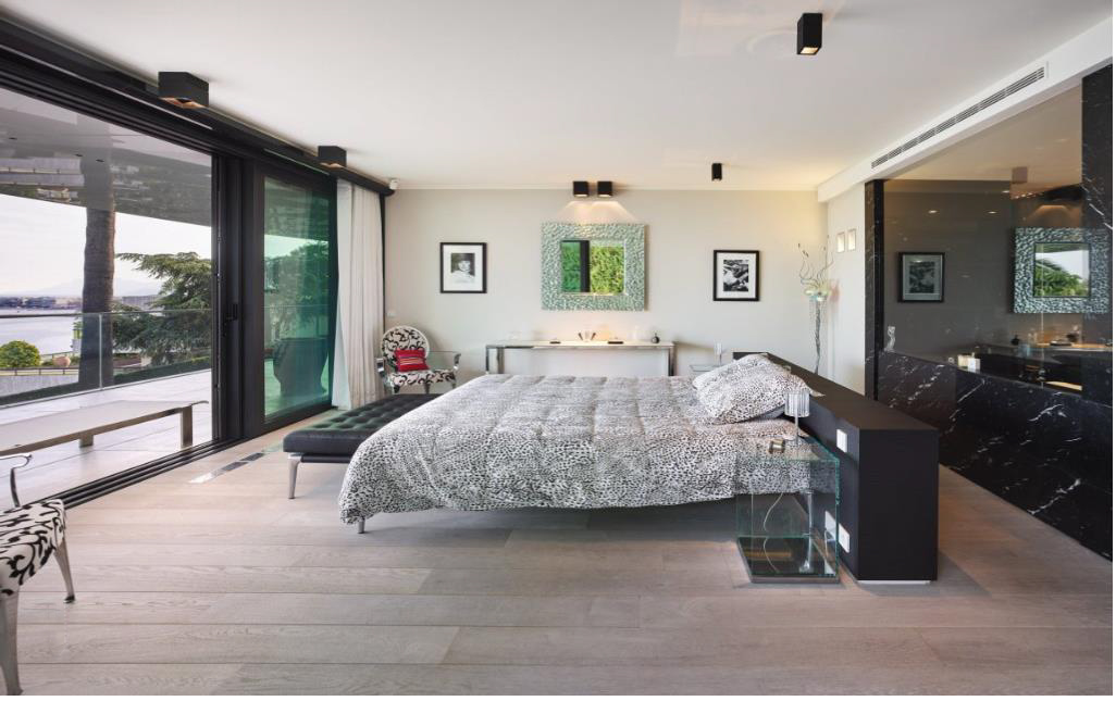 La chambre principale de 47 m2 dispose d'un dressing et d'une salle de bain en marbre avec douche, baignoire balnéothérapie et toilettes japonaises Toto.