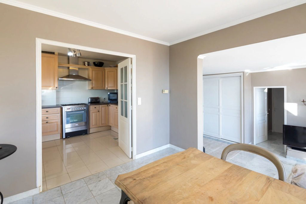 L'appartement comprend : un séjour avec cheminée et accès à une grande terrasse de 50 m², une salle à manger, une cuisine séparée, deux chambres dont une donnant sur la terrasse, une salle de douche avec WC, un WC séparé et un véranda.
