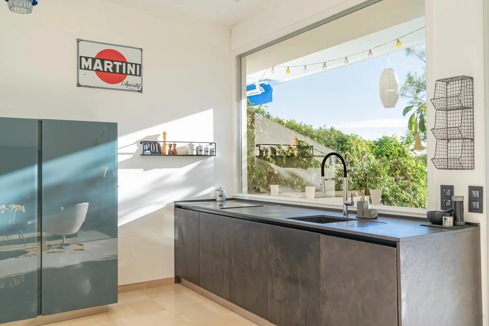 Rez-de-jardin : 1 WC 1 m², 1 Séjour/cuisine 37 m² (Sud), 1 chambre 17 m² (Ouest), 1 chambre 11 m² (Ouest), 1 salle d'eau, 1 mezzanine, 1 salle de bain/WC, 1 Dressing 6 m², 1 Jardin 270 m² (Sud-Ouest), 1 Terrasse 22 m² (Ouest), 1 Cave 5 m² (situé au niveau de la piscine), 1 Terrasse 25 m² (Sud).