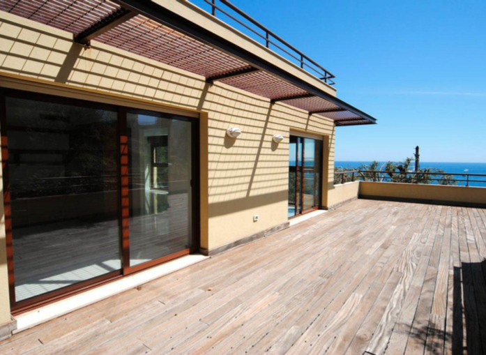 Dans une copropriété très récente, spacieux appartement de 2 chambres de 117 m², dans un état général parfait et avec de nombreux avantages luxueux. Hall d'entrée, double séjour lumineux avec de magnifiques fenêtres en verre, cuisine indépendante et équipée, deux chambres avec placards, deux salles de bains dont une avec jacuzzi et bain à remous, toilettes séparées. Grande terrasse de 65 m² parfaitement exposée, plus petit balcon de 7 m². Une cave avec porte blindée et deux places de parking. Vue imprenable sur la baie de Roquebrune. La résidence est située dans un emplacement idéal pour aller à la Principauté de Monaco.