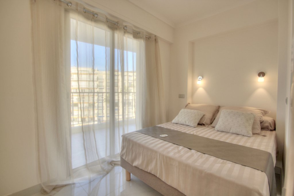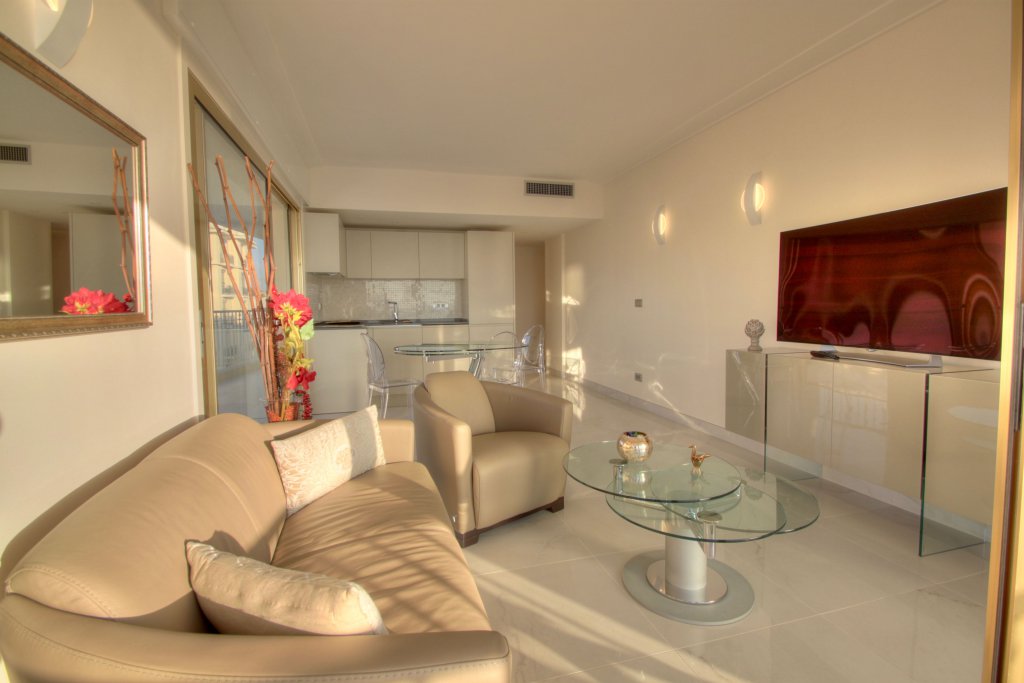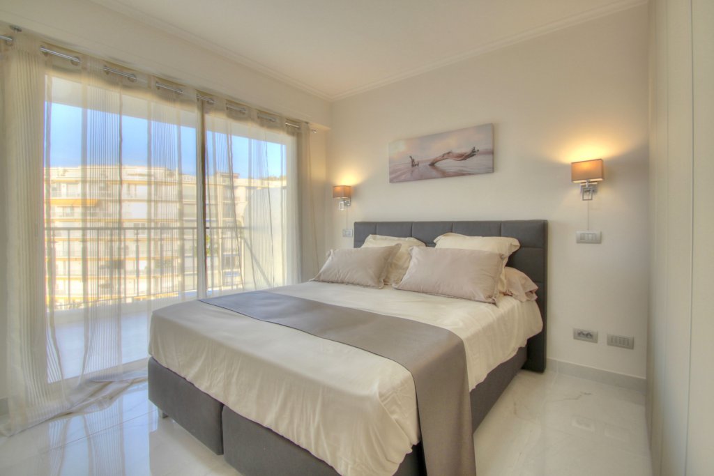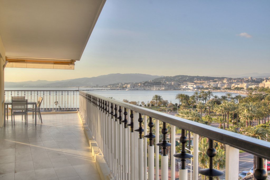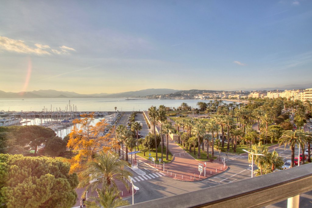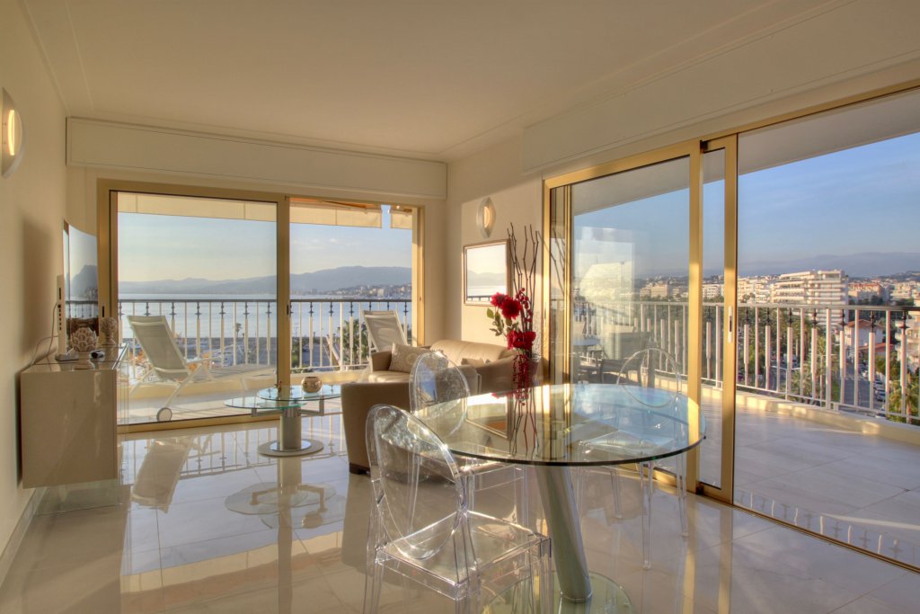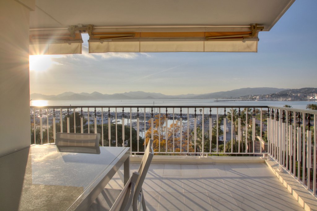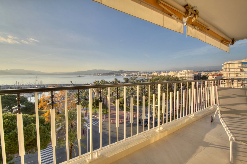 Dans un bel immeuble de standing avec gardien, sécurisé, en etage élève, trop pieces entièrement rénové luxuseument avec très grande terrasse d'angle et vue mer et de la fameuse croisette ,exceptionnelle, living deux chambres , cuisine équipée, cave , stationnement possible en face au parking du Port canto. Air conditionné, Baies vitrées, Stores électriques, Volets roulants électriques.