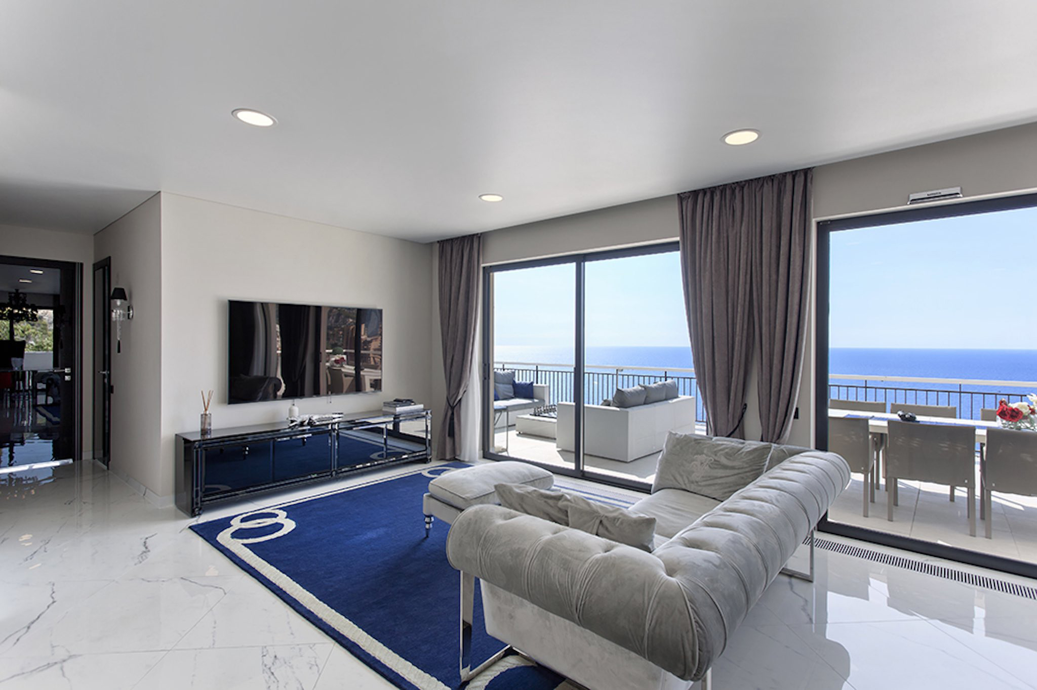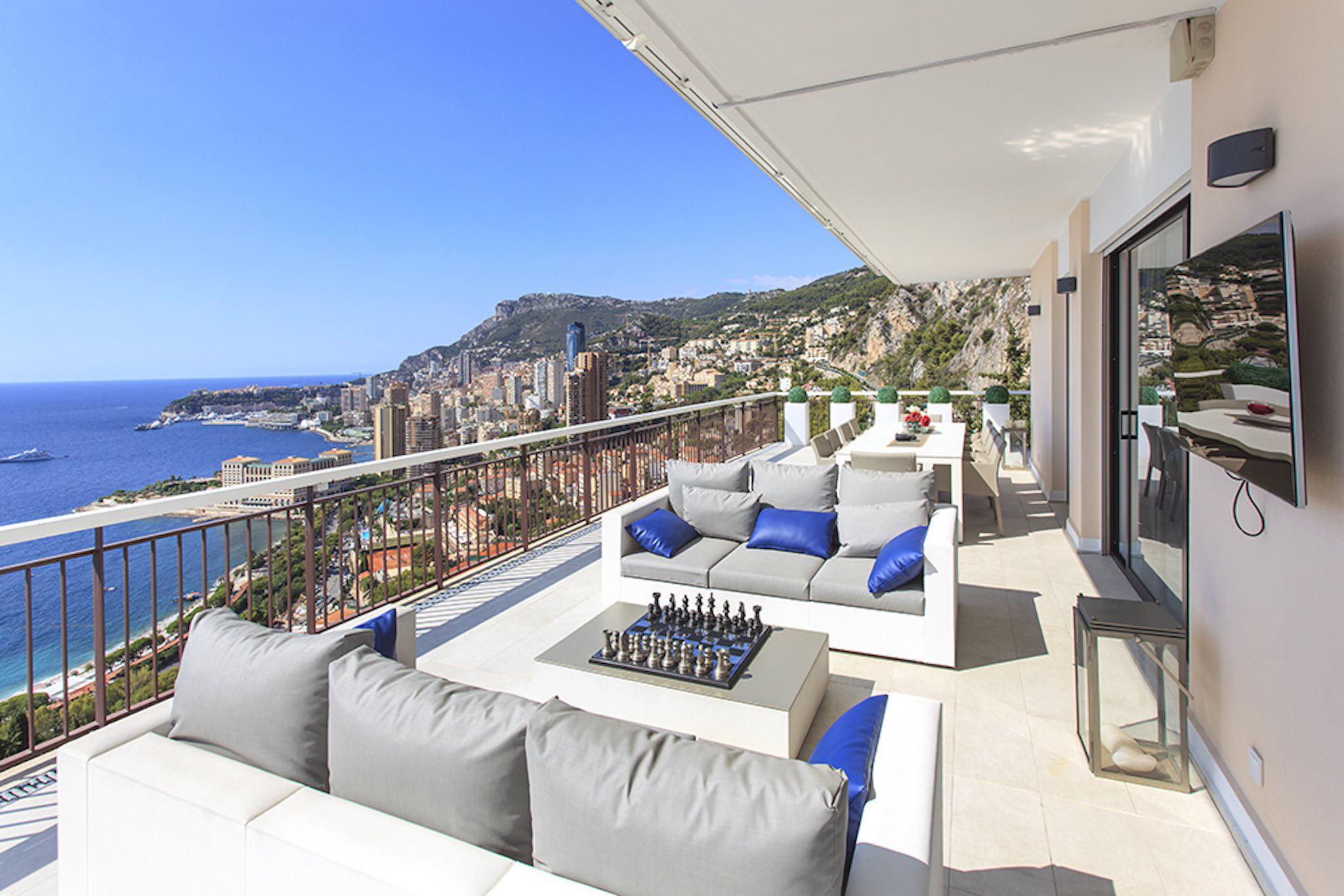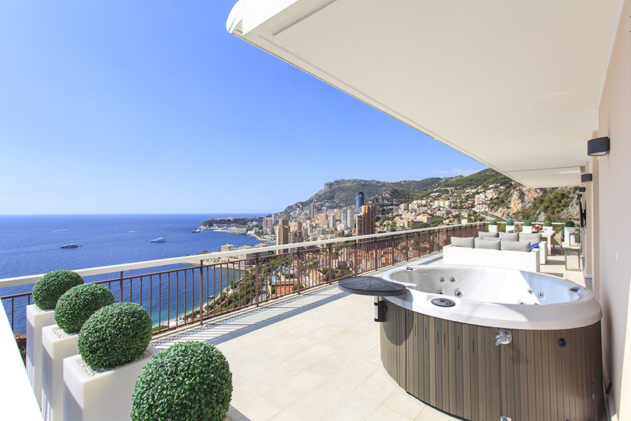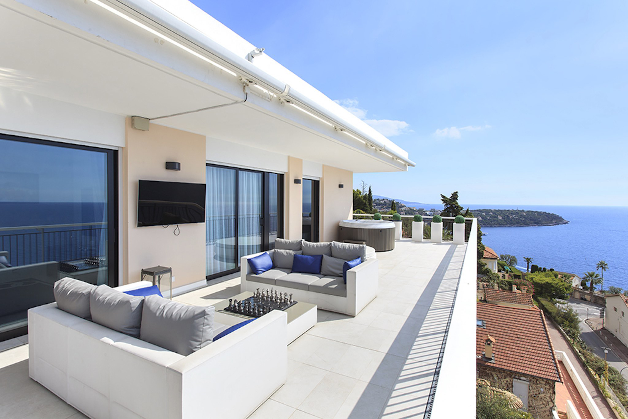 Appartement de 141 m² avec vue mer: entrée, salle à manger-salon, cuisine, buanderie, toilettes invités, bureau, 1 chambre avec dressing et salle de bains, 1 chambre avec douche. Grande terrasse de 132 m². Cave. Garage.