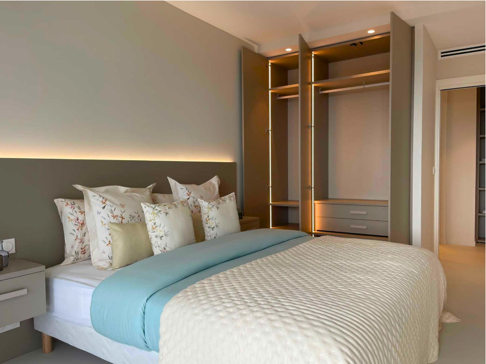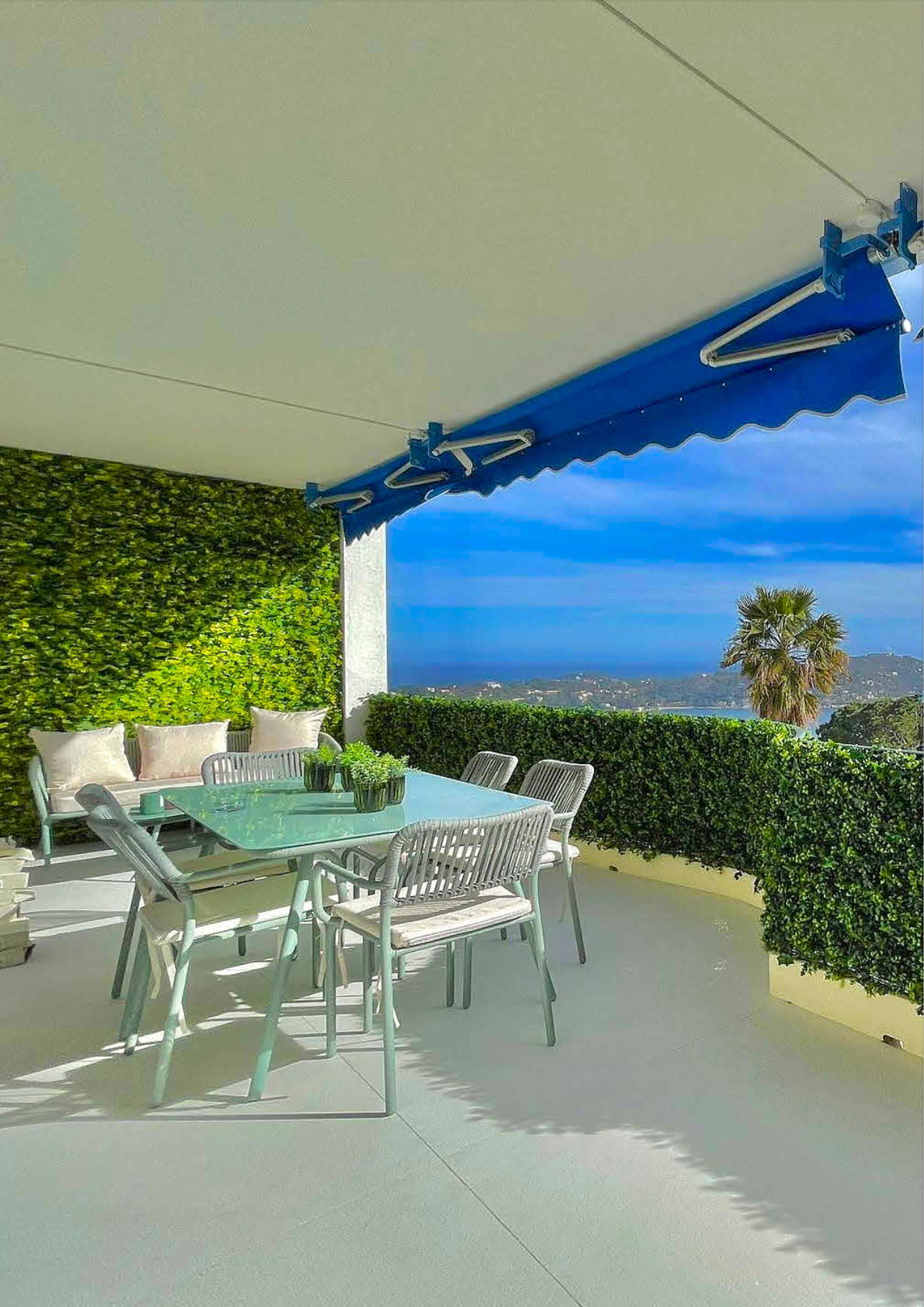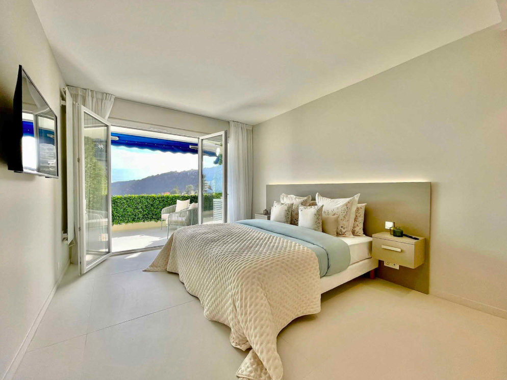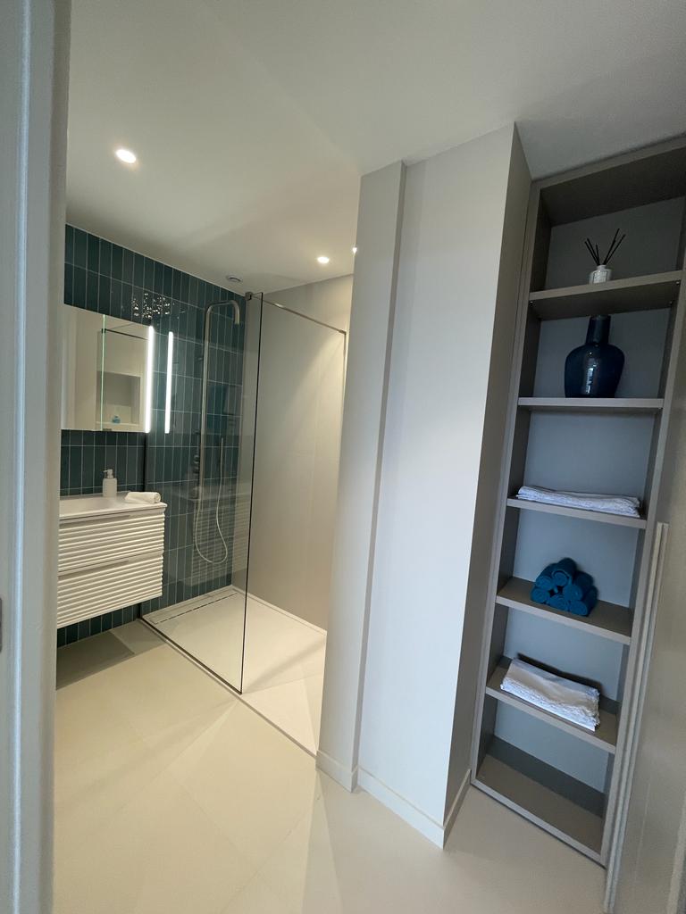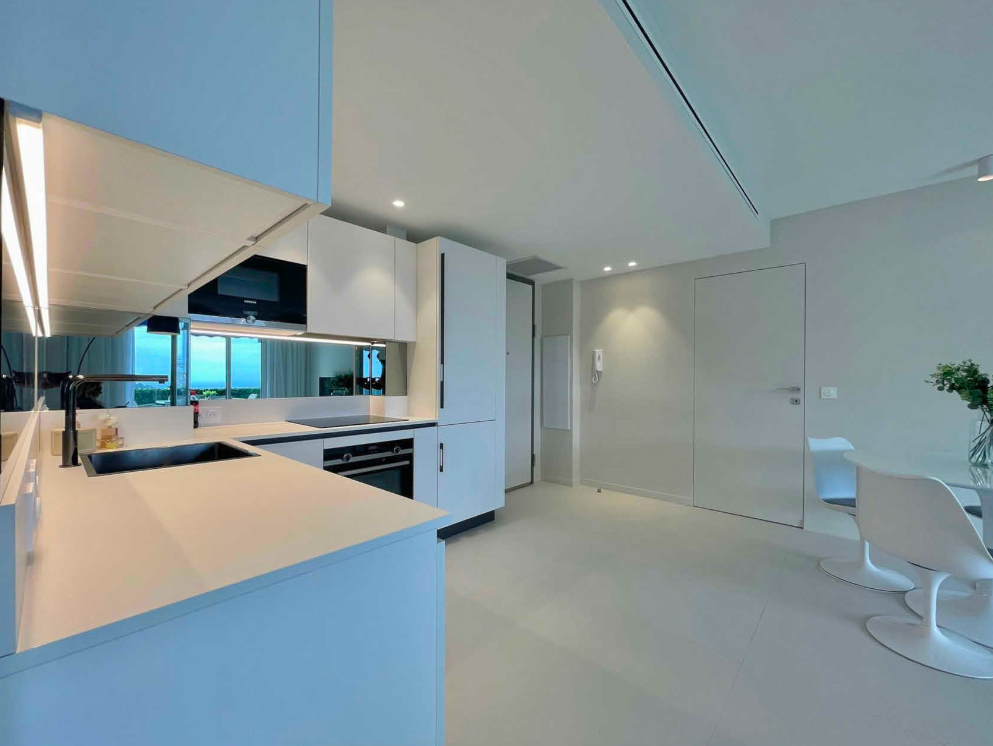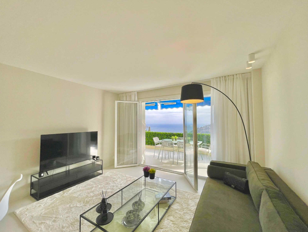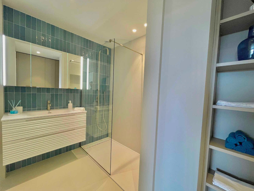 L'appartement luxueusement décoré et meublé se compose d'un hall d'entrée desservant un beau séjour avec une spacieuse terrasse de 28 m2 et une magnifique vue mer panoramique, deux chambres avec chacune sa salle de bain, une cuisine avec loggia, un WC séparé et de nombreux rangements. les espaces.