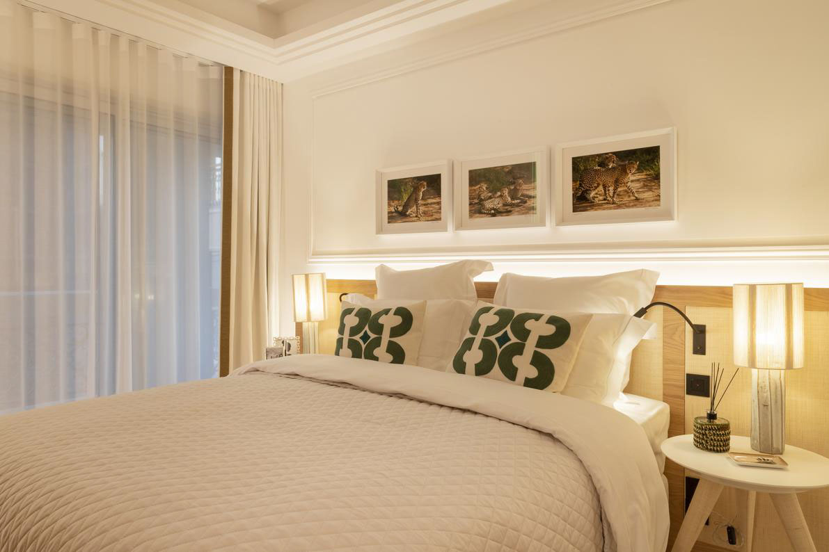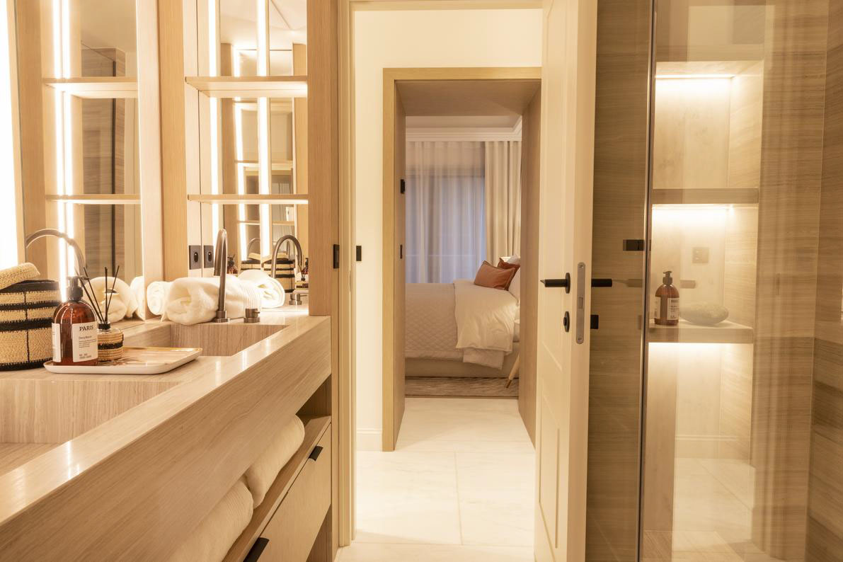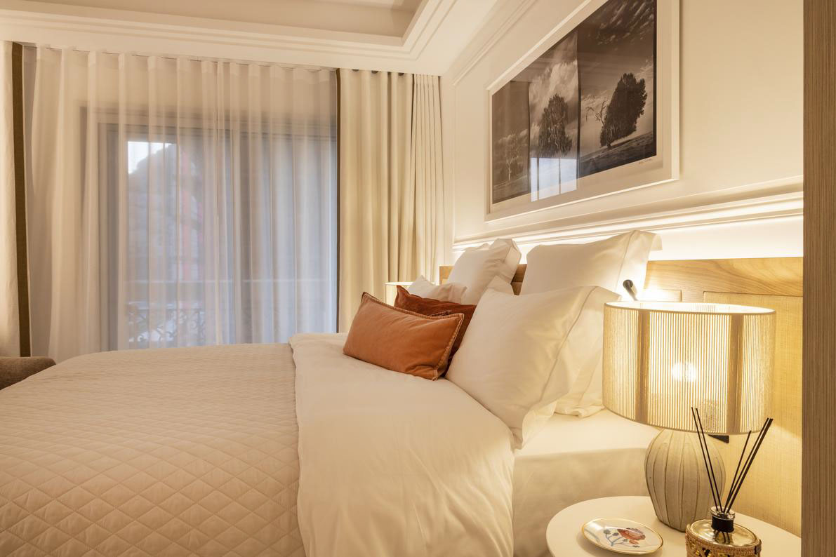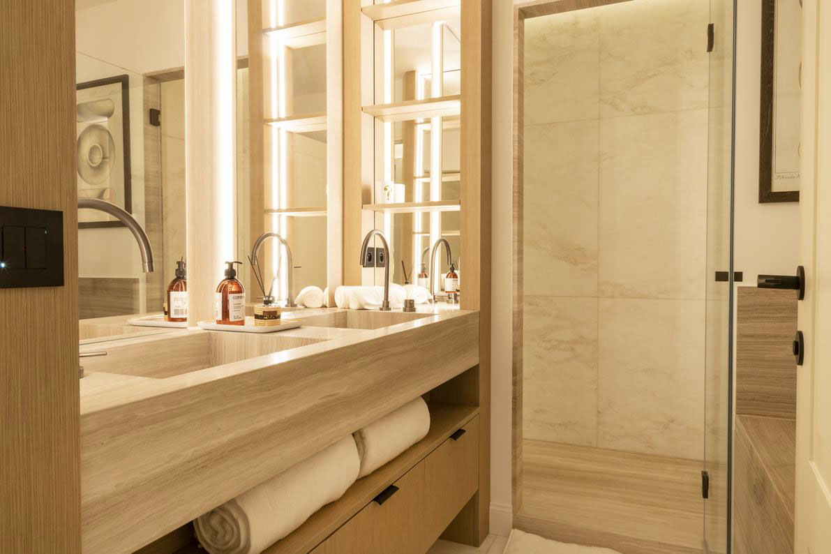 Les chambres sont séparées du salon, leur conférant une atmosphère plus privée. Chaque chambre dispose d'une salle de bain privative avec de belles finitions en pierre et en bois.