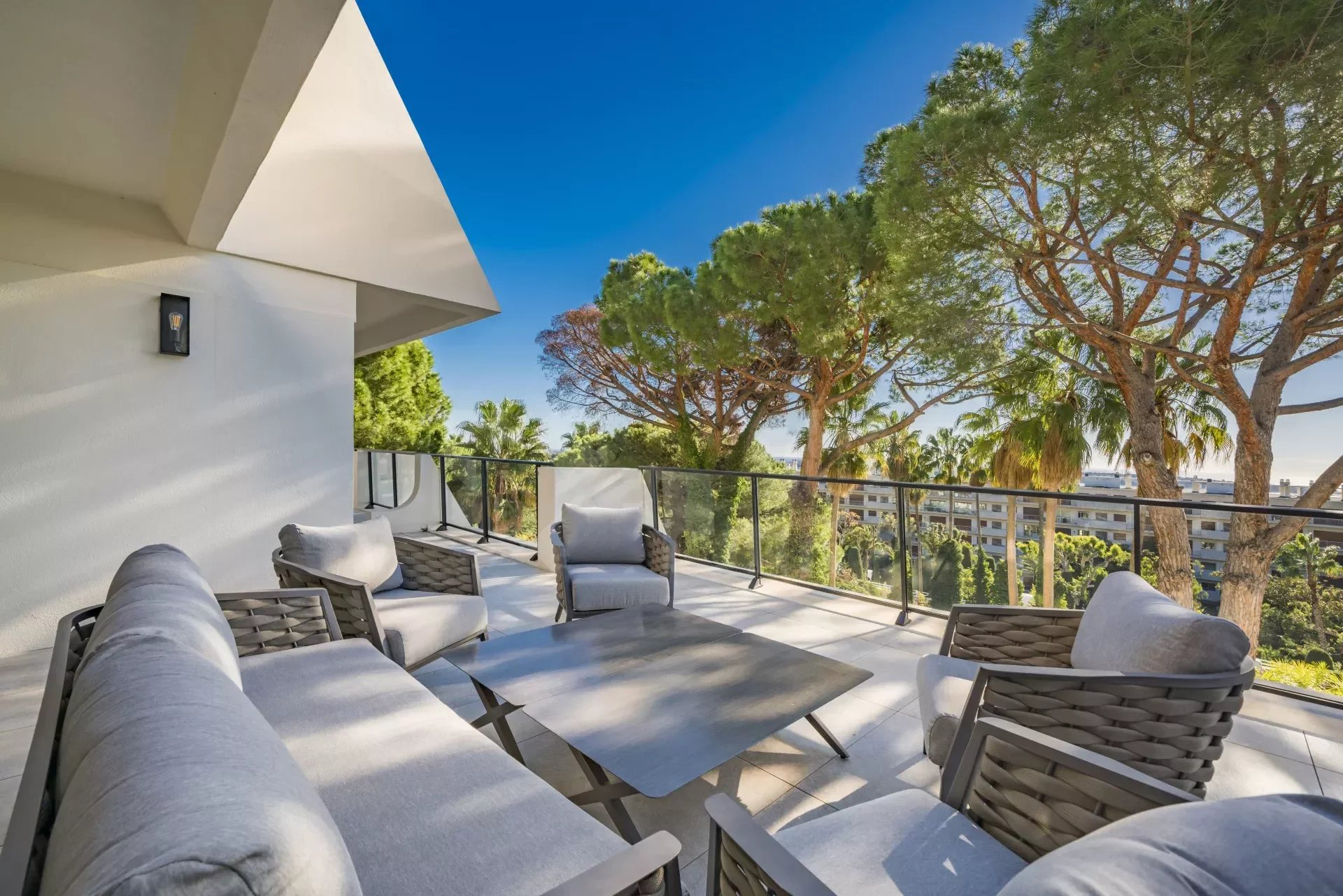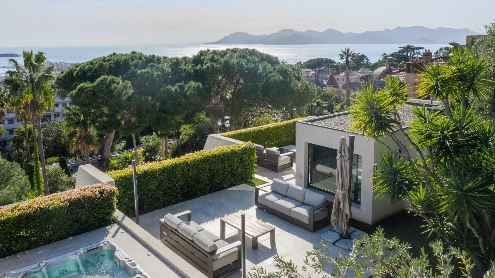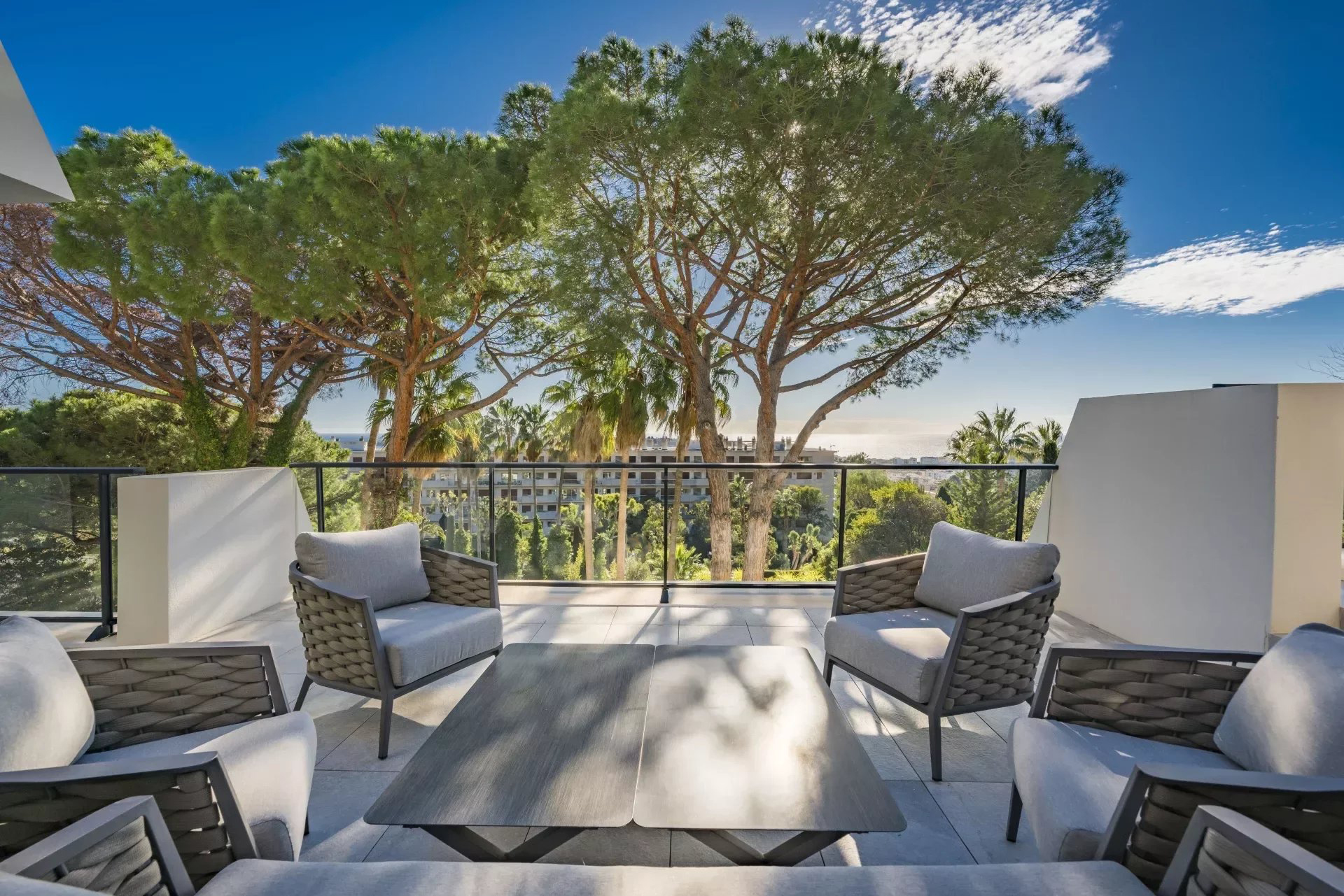 Orienté sud, le penthouse offre une vue magnifique sur la mer Méditerranée, s'ouvre sur une grande terrasse d'environ 133 m2 et dispose d'un jardin sur le toit d'environ 480 m2, superbement équipé d'une cuisine d'été et d'un jacuzzi.
