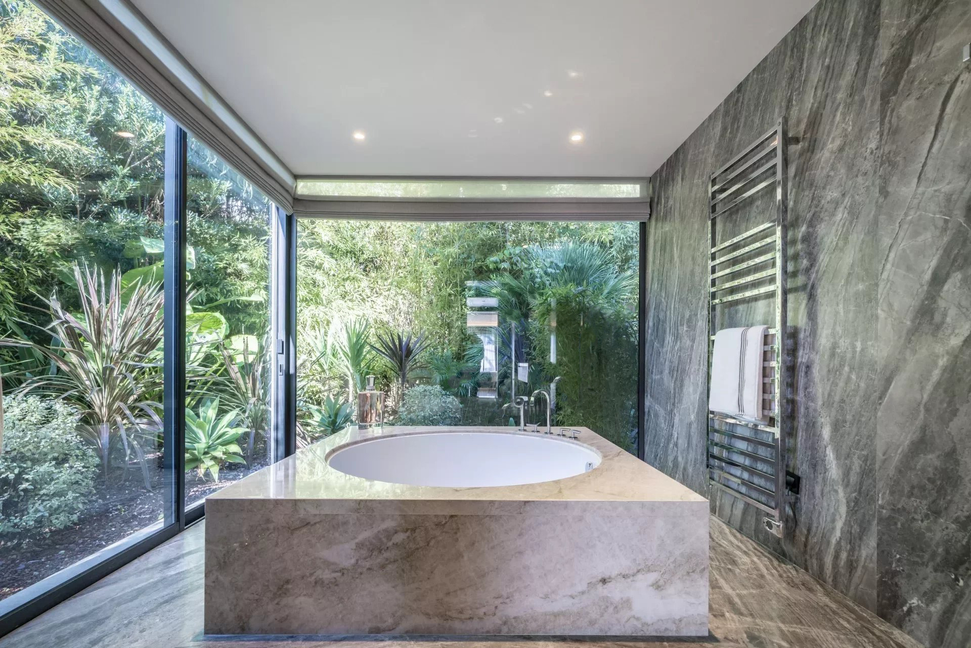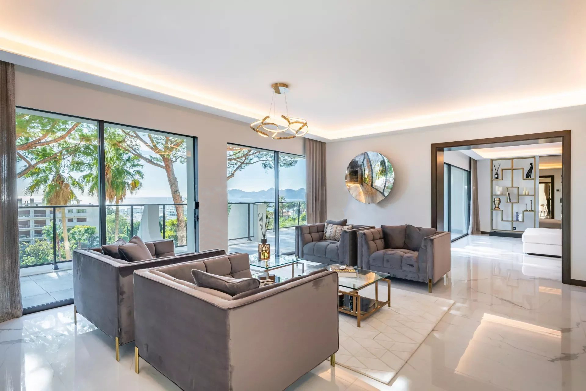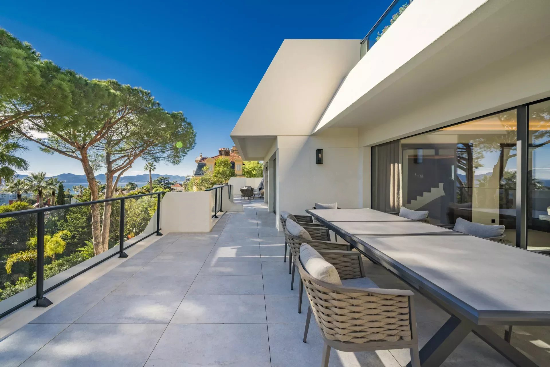 Orienté sud, le penthouse offre une vue magnifique sur la mer Méditerranée, s'ouvre sur une grande terrasse d'environ 133 m2 et dispose d'un jardin sur le toit d'environ 480 m2, superbement équipé d'une cuisine d'été et d'un jacuzzi.