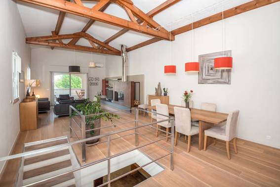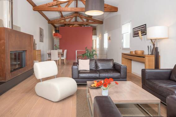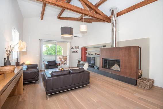 - Salon avec salle à manger avec cheminée et accès à la terrasse