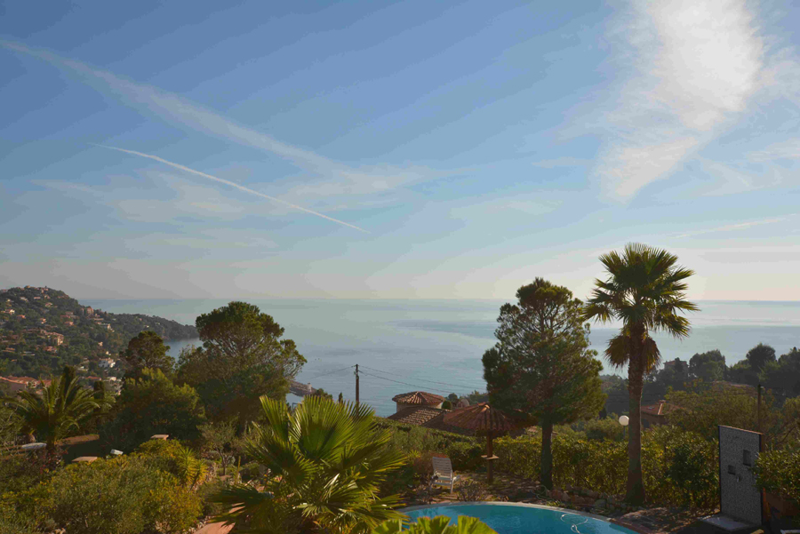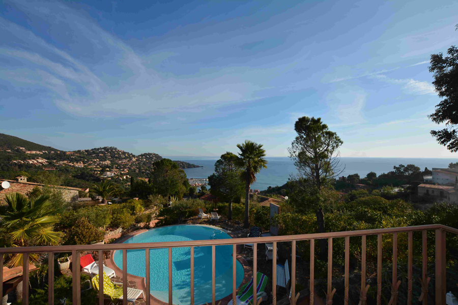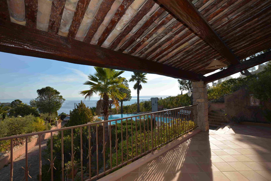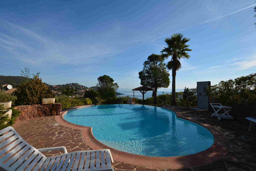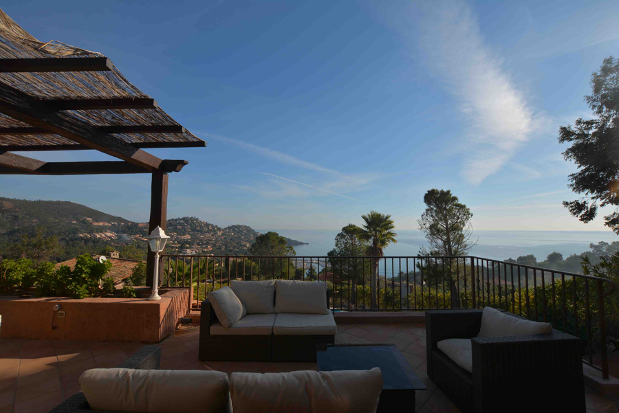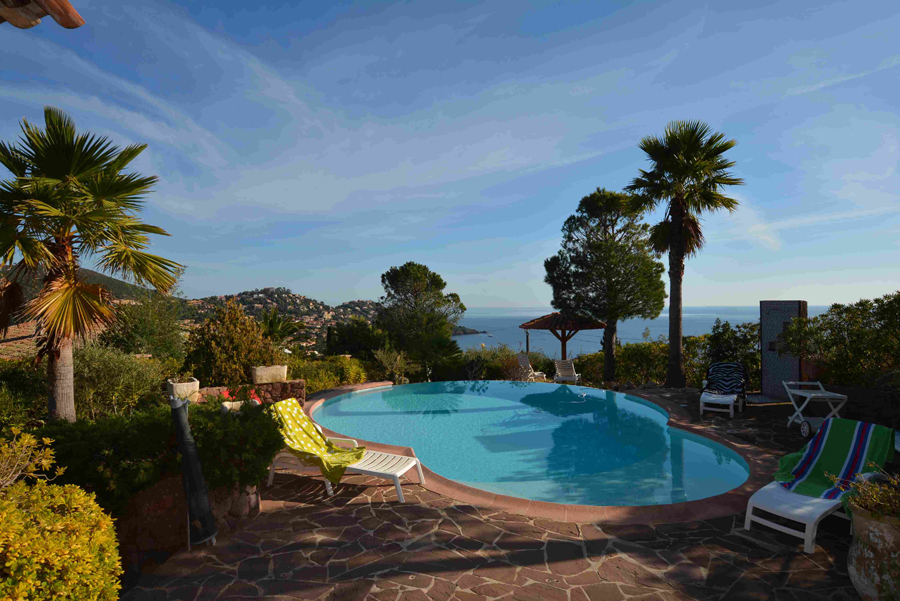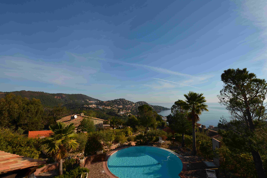 Dans un cadre enchanteur avec pleine vue mer et Estérel, belle propriété en parfait état avec prestations de qualité disposant de 5 grandes chambres - dont une de plain-pied avec le séjour - chacune avec sa salle de bains avec toilettes et placards + une chambre avec cabinet de toilette pour le personnel