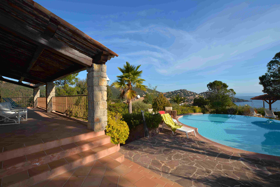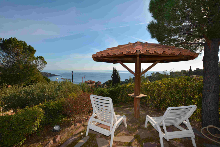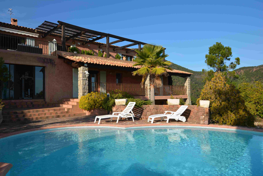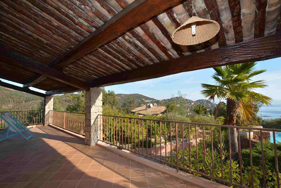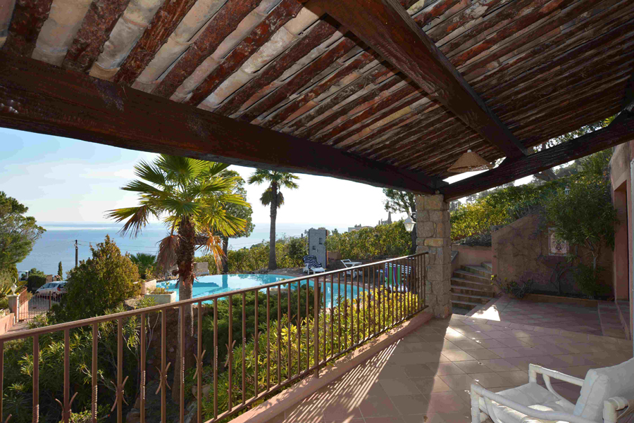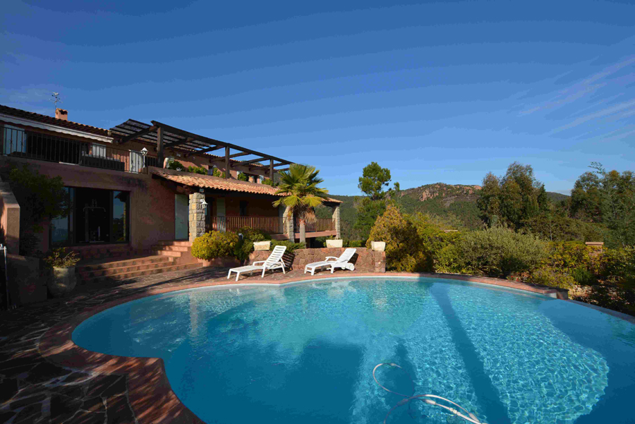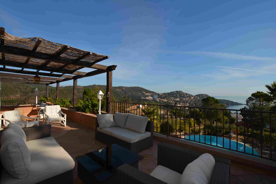 Dans un cadre enchanteur avec pleine vue mer et Estérel, belle propriété en parfait état avec prestations de qualité disposant de 5 grandes chambres - dont une de plain-pied avec le séjour - chacune avec sa salle de bains avec toilettes et placards + une chambre avec cabinet de toilette pour le personnel