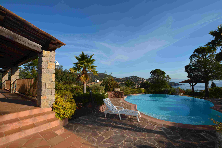 Larges terrasses offrant une vue panoramique sur la mer et/ou sur l'Estérel sans aucun vis-à-vis - Grandes baies vitrées en galandage . Jardin paysager avec piscine à débordement au sel - Pool-house