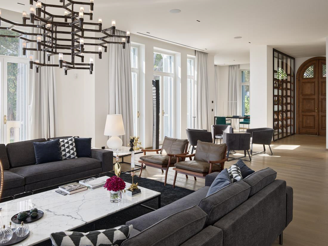 Grande double réception, salon, salle à manger, bureau.