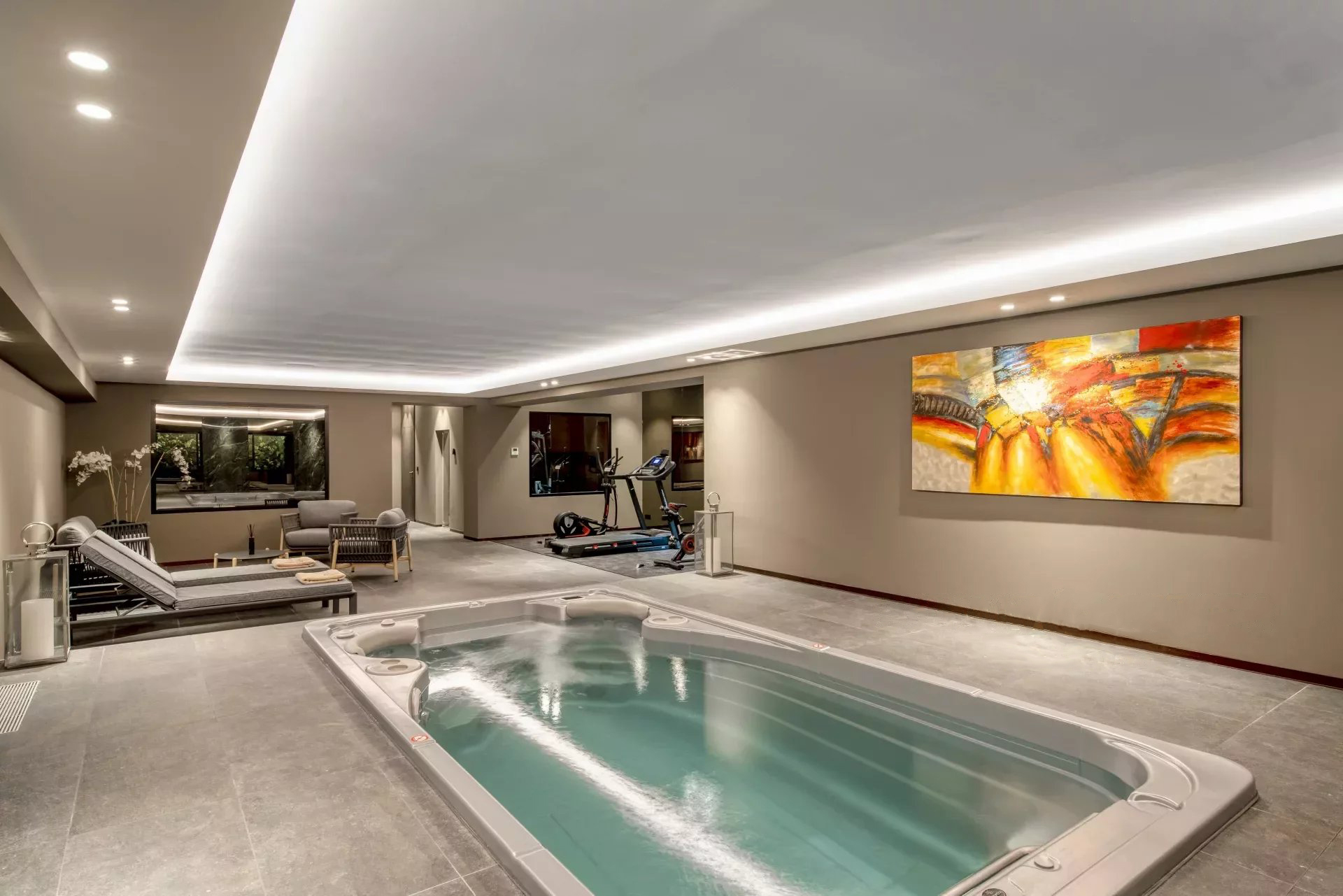 Climatisation, Double vitrage, Volets roulants électriques, Ascenseur, Alarme, Conciergerie, Porte Blindée, Vidéophone, Piscine en copropriété, Sauna, Spa, Domotique, Jacuzzi, Stores électriques, Eclairage extérieur, Fenêtres coulissantes, Internet, Maison de gardien, Piscine.