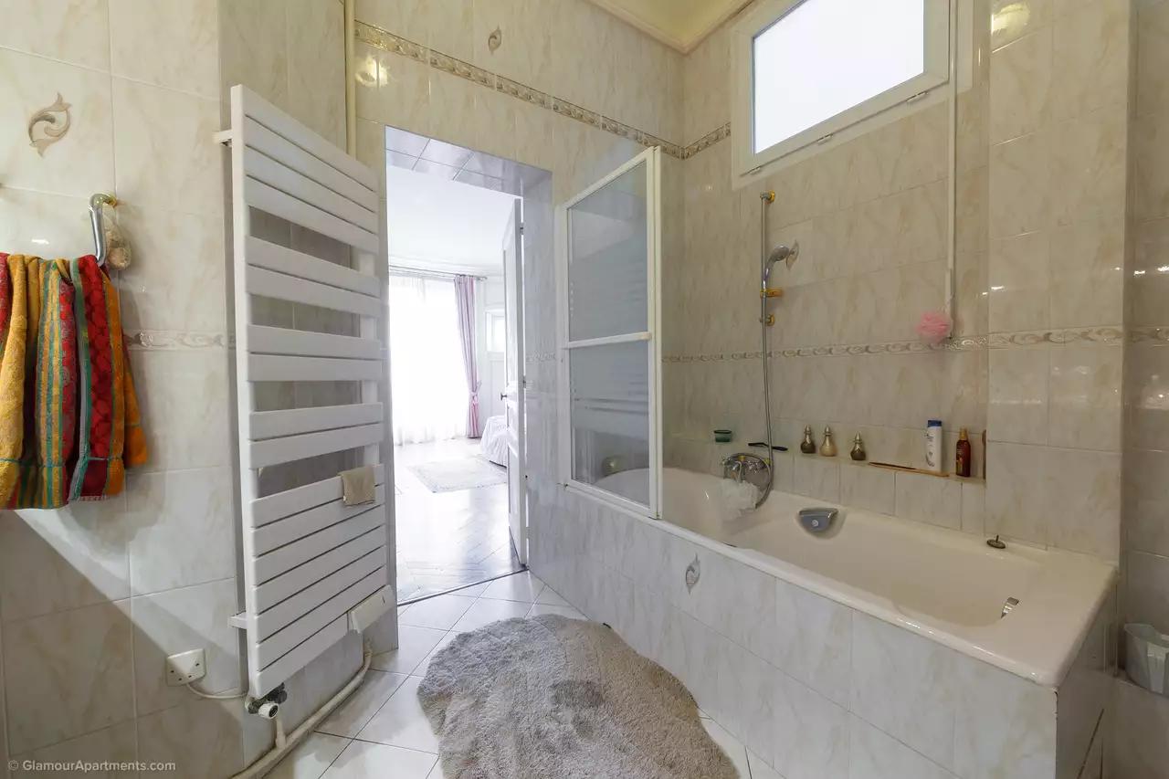 Galerie d'entrée, spacieux double séjour avec balcon et vue imprenable sur le parc du Trocadéro et la tour Eiffel (accessible à pied), belle salle à manger, 4 chambres chacune avec salle de bains et placard, cuisine. Les décorations murales sont uniques au monde.