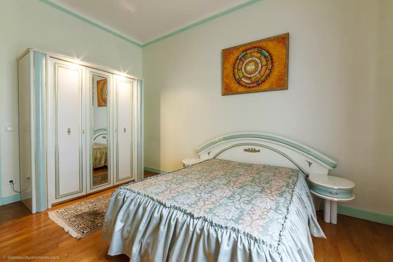 L'appartement se compose de: hall d'entrée avec placard intégré (24,20 m2), grand salon (36,55 m2), petit salon (19,15 m2), salle à manger (31,40 m2), cuisine (13,60 m2), bureau (9,75 m2) ), 4 chambres (23,70 m2, 15,85 m2, 22,40 m2, 14,90 m2), salle de bains avec bidet et WC (8,15 m2), salle de bains avec WC (4,35 m2), salle d'eau avec WC (3,90 m2). Terrasse 7,55 m2.