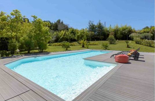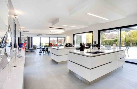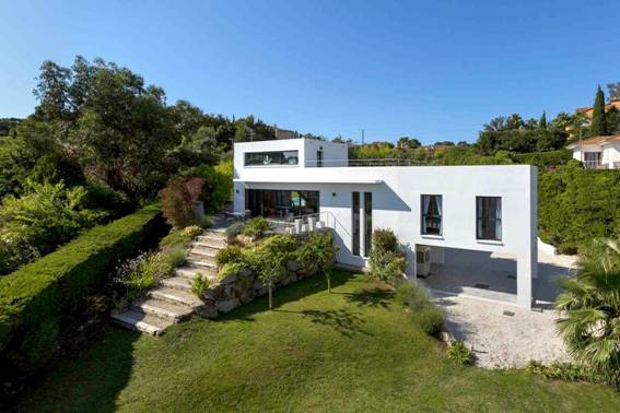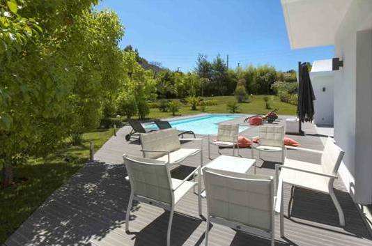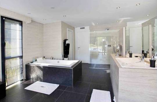 Une nouvelle villa de style moderne, situé dans un grand espace, a un beau jardin. La maison est décorée avec de belles terrasses et une piscine.
