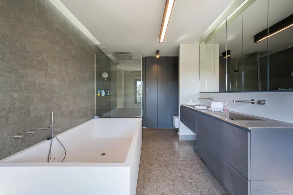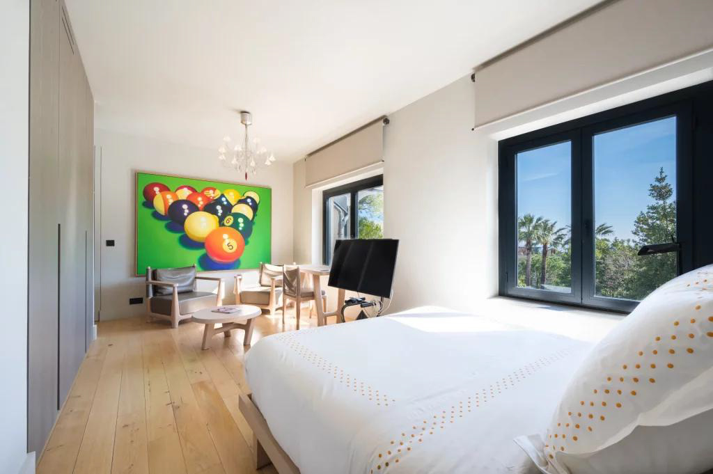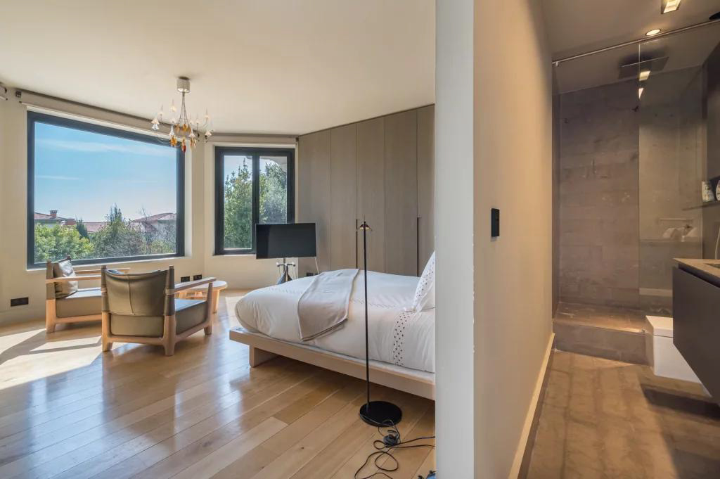 Aux deux étages supérieurs, nous trouvons 9 chambres luxueuses, chacune équipée d'un débarras, d'un dressing et d'une salle de bains. La grande chambre principale offre plus de 80 m2 avec 2 dressings et une grande salle de bain avec vue dégagée mer et montagne.