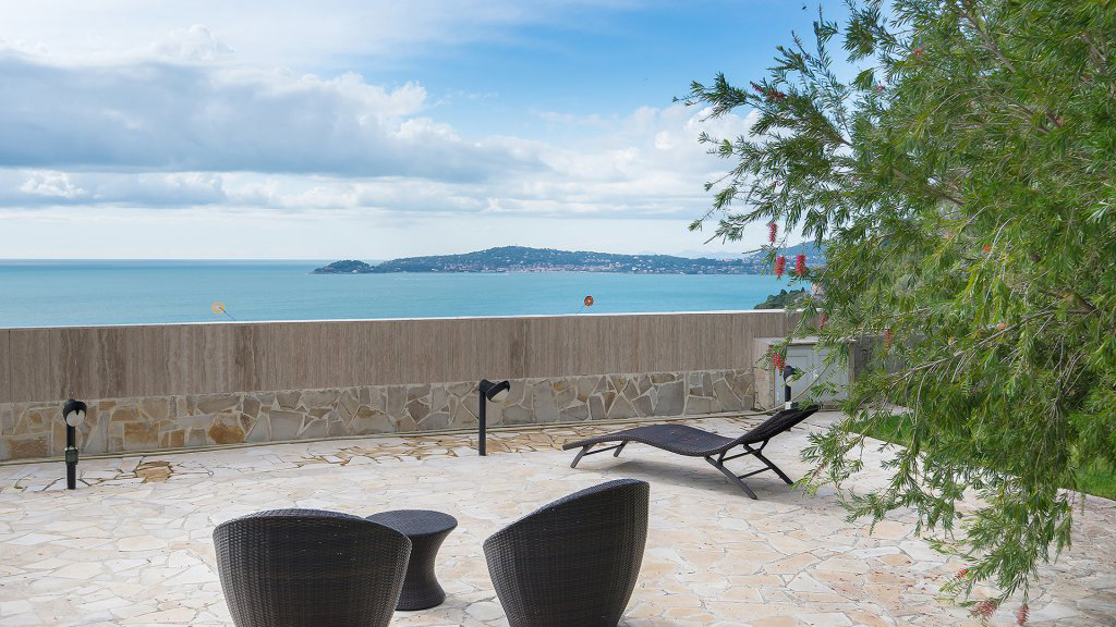 Grand jardin plat de plus de 1.000 m² avec vue mer panoramique.