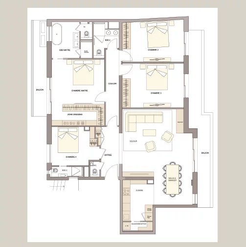 L'appartement d'une superficie totale de 190 m2 se compose d'un hall d'entrée desservant un séjour avec accès à un balcon, une salle à manger, une cuisine, 4 belles chambres avec une salle de bains, un dressing et un balcon.