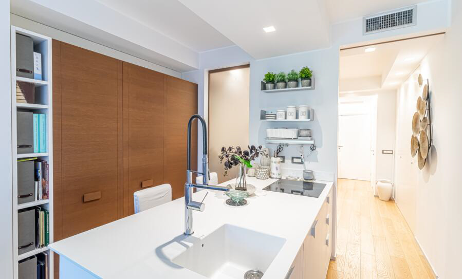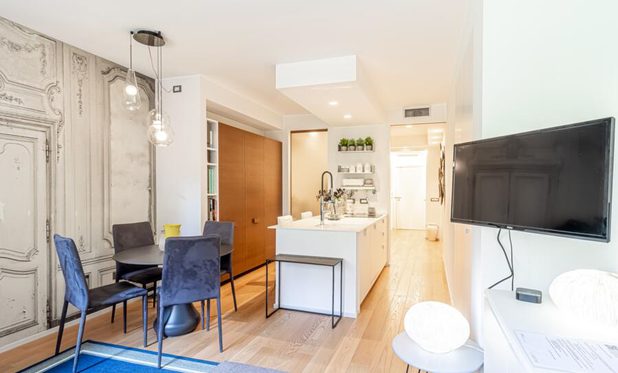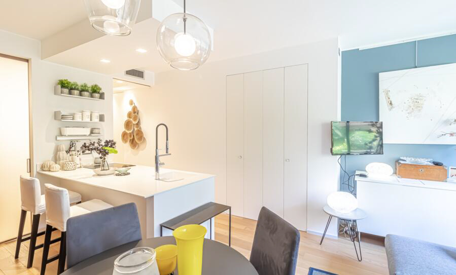 Le studio comprend une grande pièce à vivre avec cuisine équipée et îlot central, coin nuit, salle d'eau et toilettes invités.