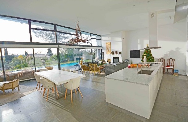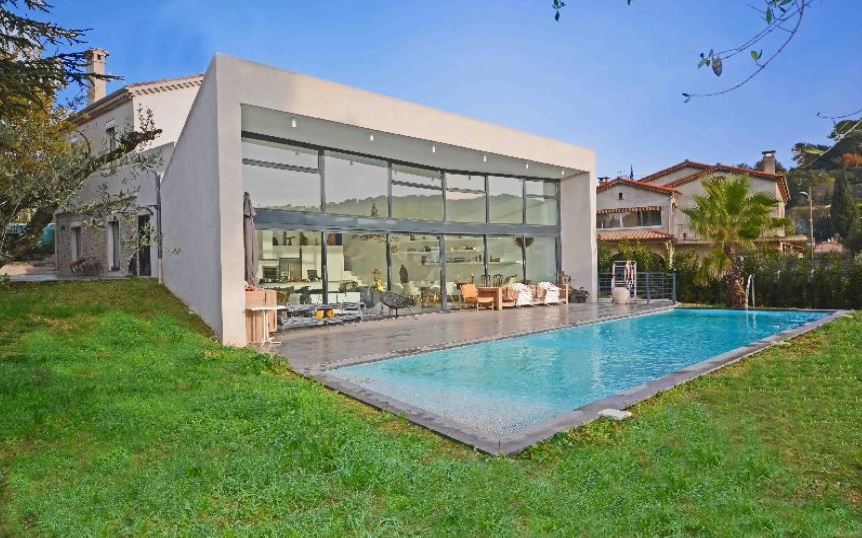 Belle villa moderne sur la Côte d'Azur, situé dans un quartier résidentiel calme, à proximité du village. Sur le territoire d'un magnifique jardin et une piscine, ainsi que, appartement libre-debout.