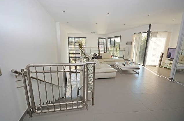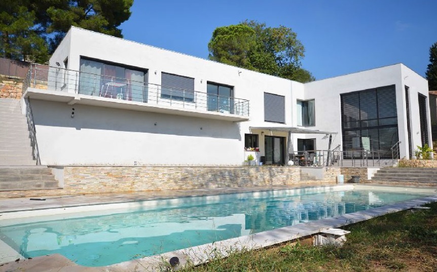 Villa moderne sur la Côte d'Azur, situé dans un quartier très recherché de Mougins, avec de belles vues sur la campagne. Les fenêtres orientées au sud. Sur le territoire d'un grand terrain, terrasse et piscine.