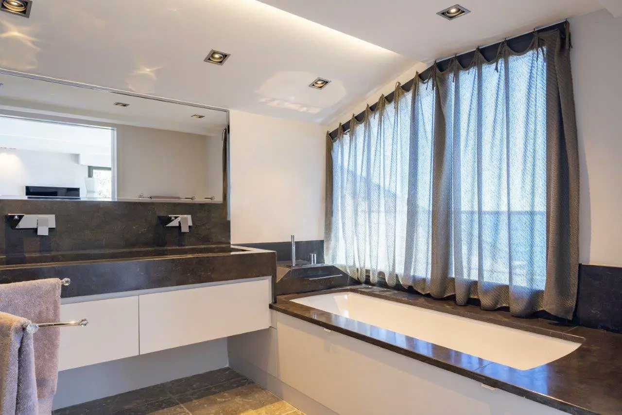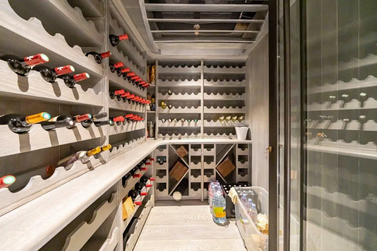 Une chambre au rez-de-chaussée où se trouvent le salon, la cuisine et la salle TV. Deux chambres au niveau inférieur. Les autres commodités comprennent une cave à vin, des toilettes invités et une buanderie.