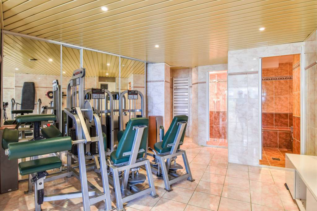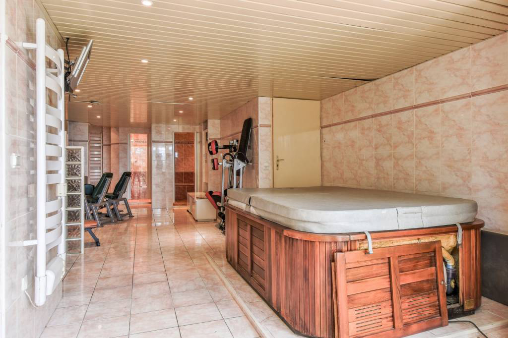 Buanderie, sous-sol et salle de sport avec jacuzzi, hammam, sauna, douche et WC au rez-de-jardin.
