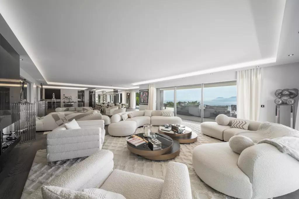 Avec une vue imprenable sur la mer, la Baie de Cannes et le massif de l'Estérel, à 10 minutes en voiture de la Croisette, exposée sud-ouest, sans aucun vis-à-vis, impressionnante villa neuve de style moderne de 700 m². avec un jardin paysagé de 3200 m². avec piscine à débordement chauffée.
